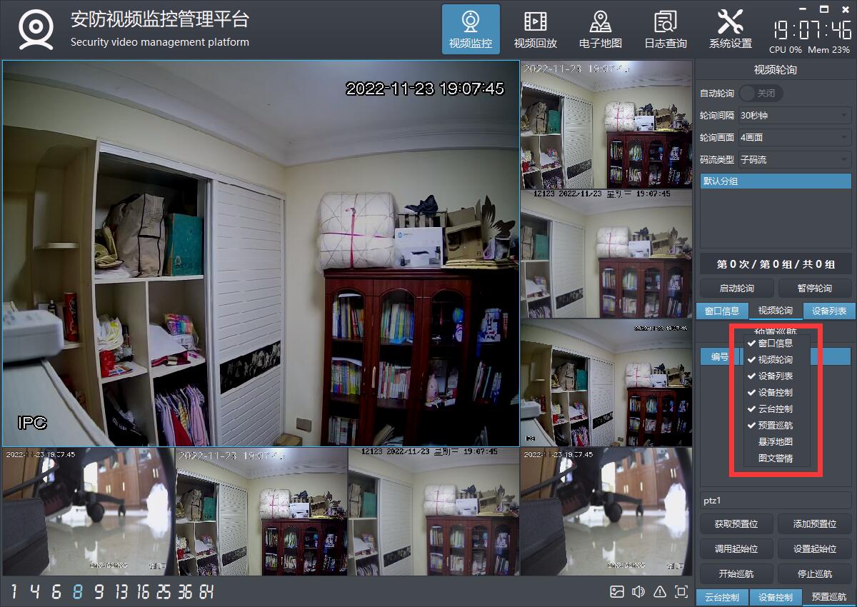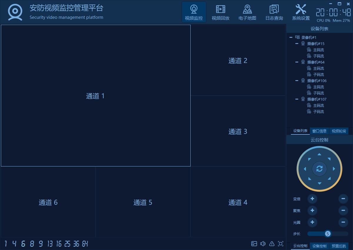 主要功能包括摄像机管理,实时视频显示,视频轮询、视频存储、设备地图显示,各种画面切换,各种悬停子模块、onvif搜索设备和云台控制及预置位,通用的NVR视频流播放(比如海康的NVR支持直接取流回放),录像计划、用户管理等功能。
