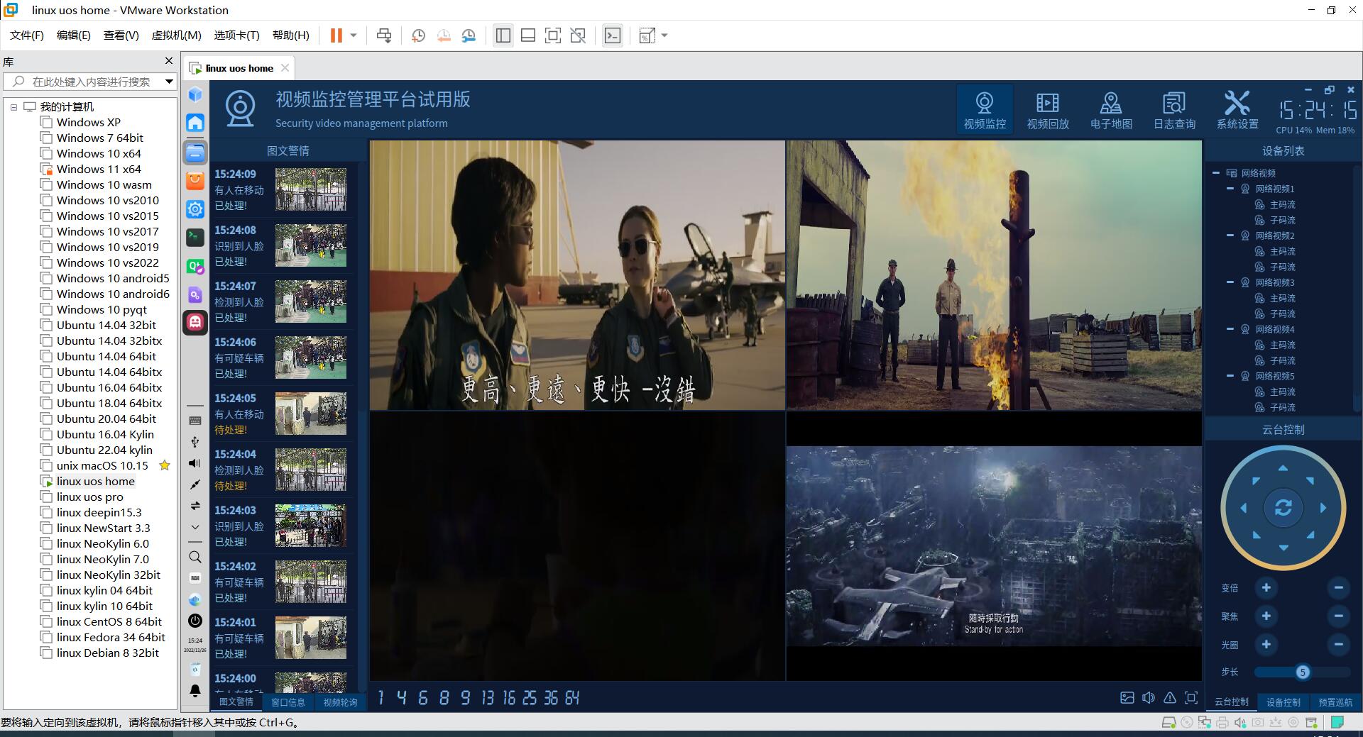 视频监控模块,各种停靠小窗体子模块,包括设备列表、图文警情、窗口信息、云台控制、预置位、巡航设置、设备控制、悬浮地图、网页浏览等。