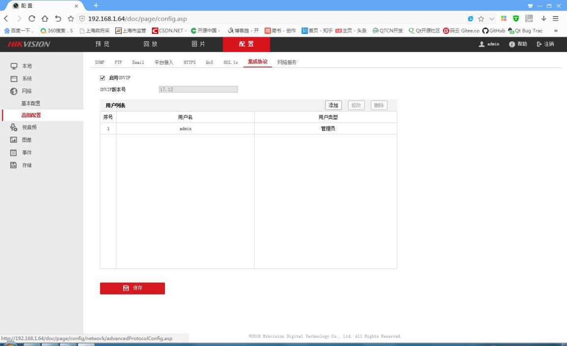 新版的海康的摄像机,默认onvif是关闭的,需要手动开启,开启以后记得添加onvif用户,并重启摄像机应用。提示:海康旗下的萤石目前暂时不支持onvif协议。