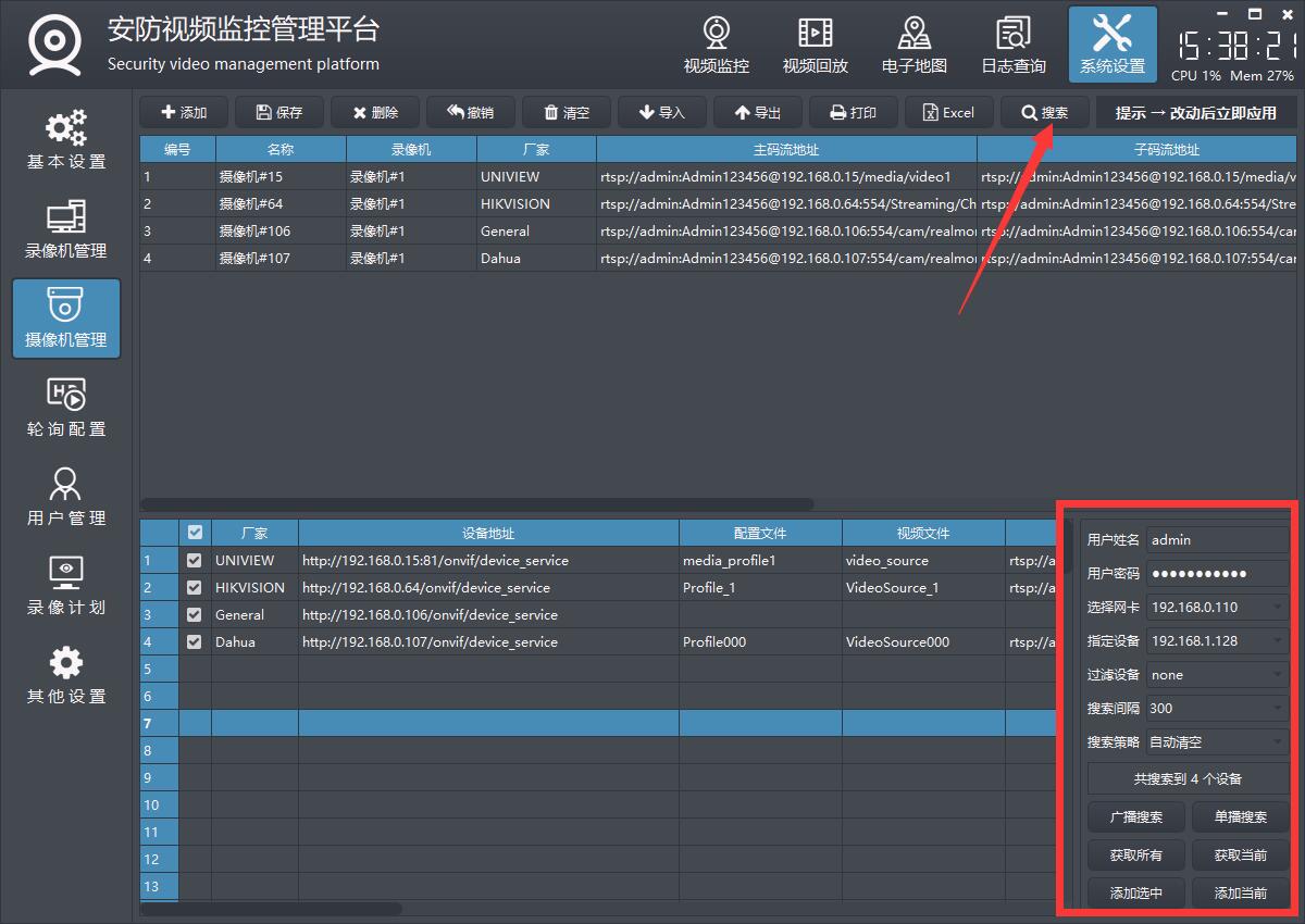 在设备搜索那边指定设备填入IP地址和端口,单击单播搜索按钮,会自动搜索到设备的onvif地址,然后填入onvif用户信息,此时再去单击获取所有,如果有返回信息则表示正常。
