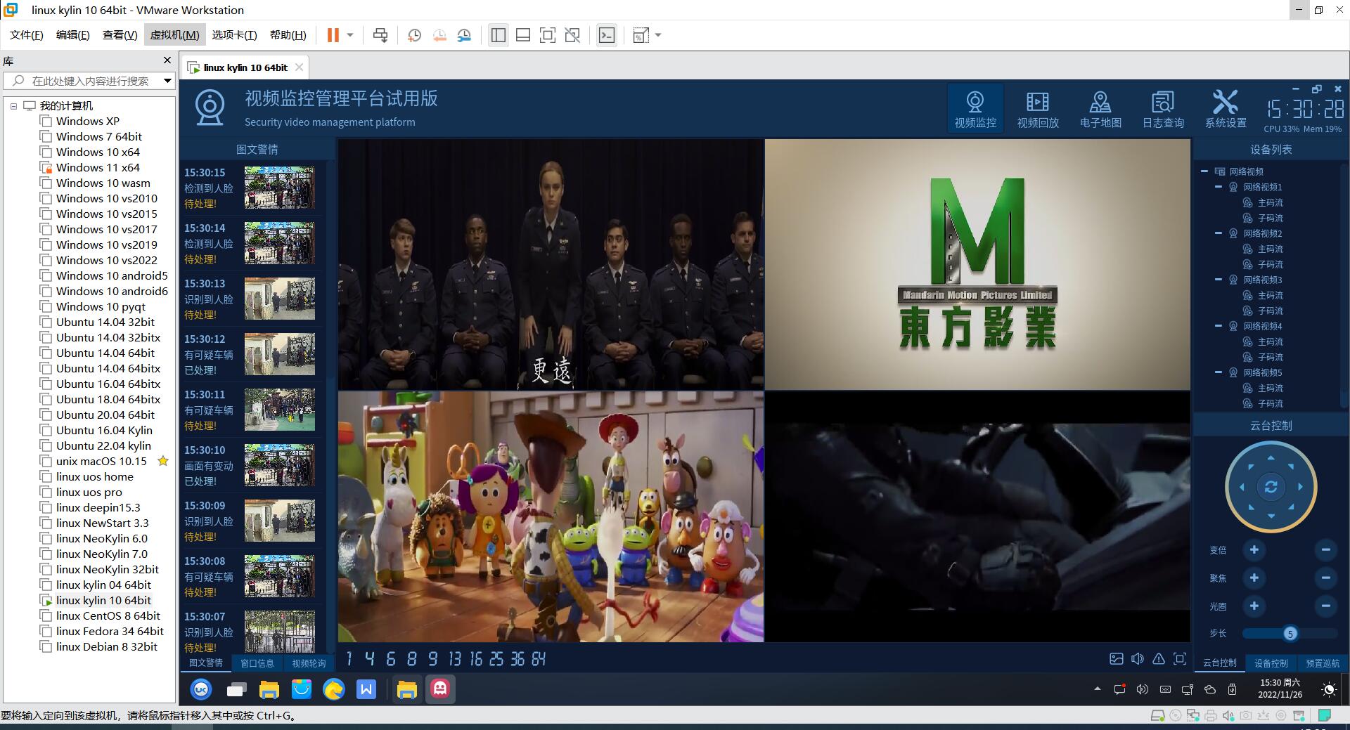 视频监控模块,各种停靠小窗体子模块,包括设备列表、图文警情、窗口信息、云台控制、预置位、巡航设置、设备控制、悬浮地图、网页浏览等。