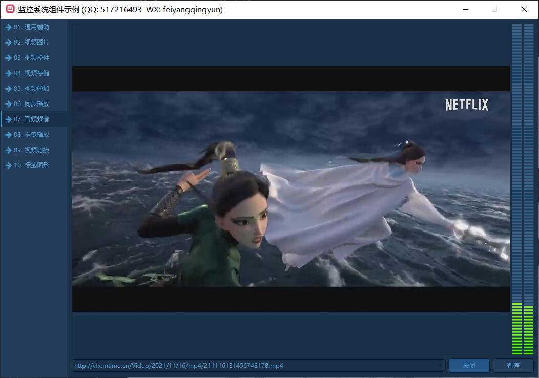 关于声音的几点说明:系统中有多个声音相关的控制参数,一个是decodeAudio,用于控制是否解码音频数据;一个是playAudio,用于控制是否将解码后的音频数据发到声卡进行播放;一个是soundMute,用于控制声音大小为静音;在视频控件上的音量图标切换是用于切换静音。音频振幅也就是音柱的变化,只要声卡那边有数据播放,无论静音与否,都会有音频振幅效果。