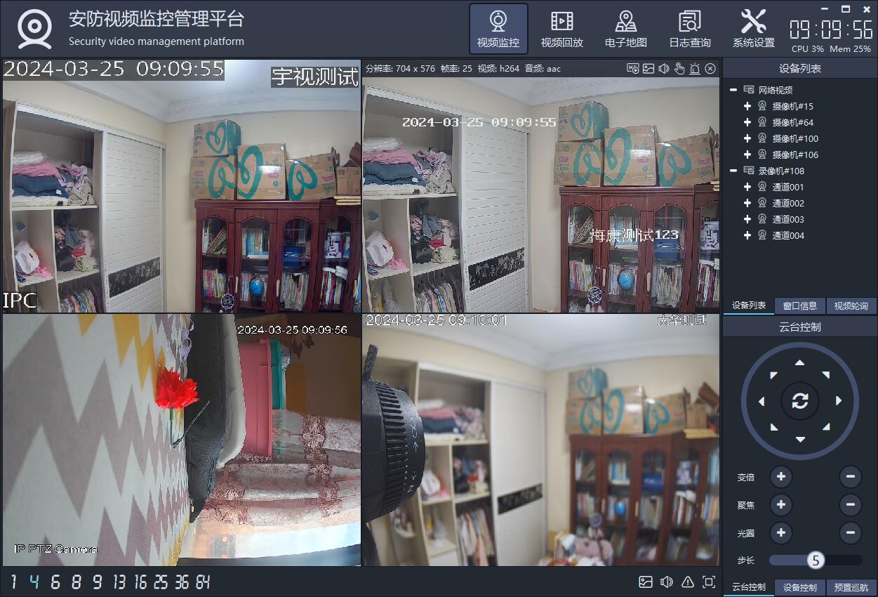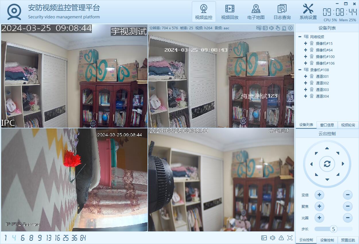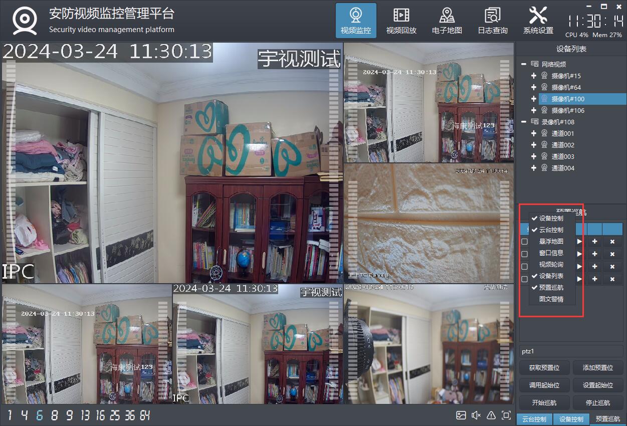 主要功能包括摄像机管理,实时视频显示,视频轮询、视频存储、设备地图显示,各种画面切换,各种悬停子模块、onvif搜索设备和云台控制及预置位,通用的NVR视频流播放(比如海康的NVR支持直接取流回放),录像计划、用户管理等功能。