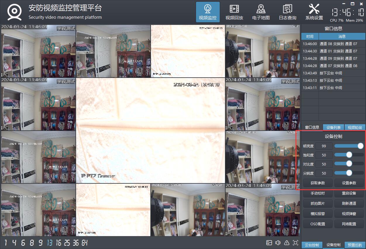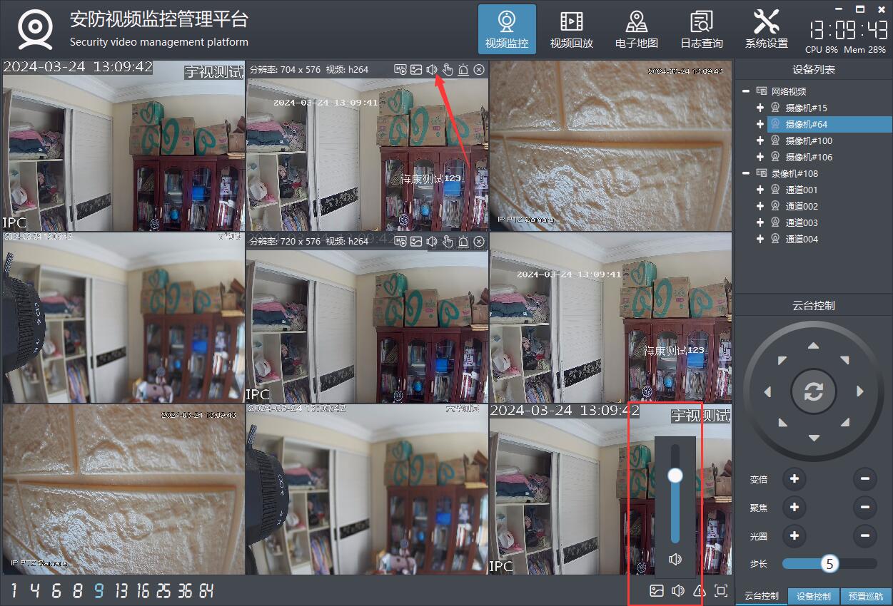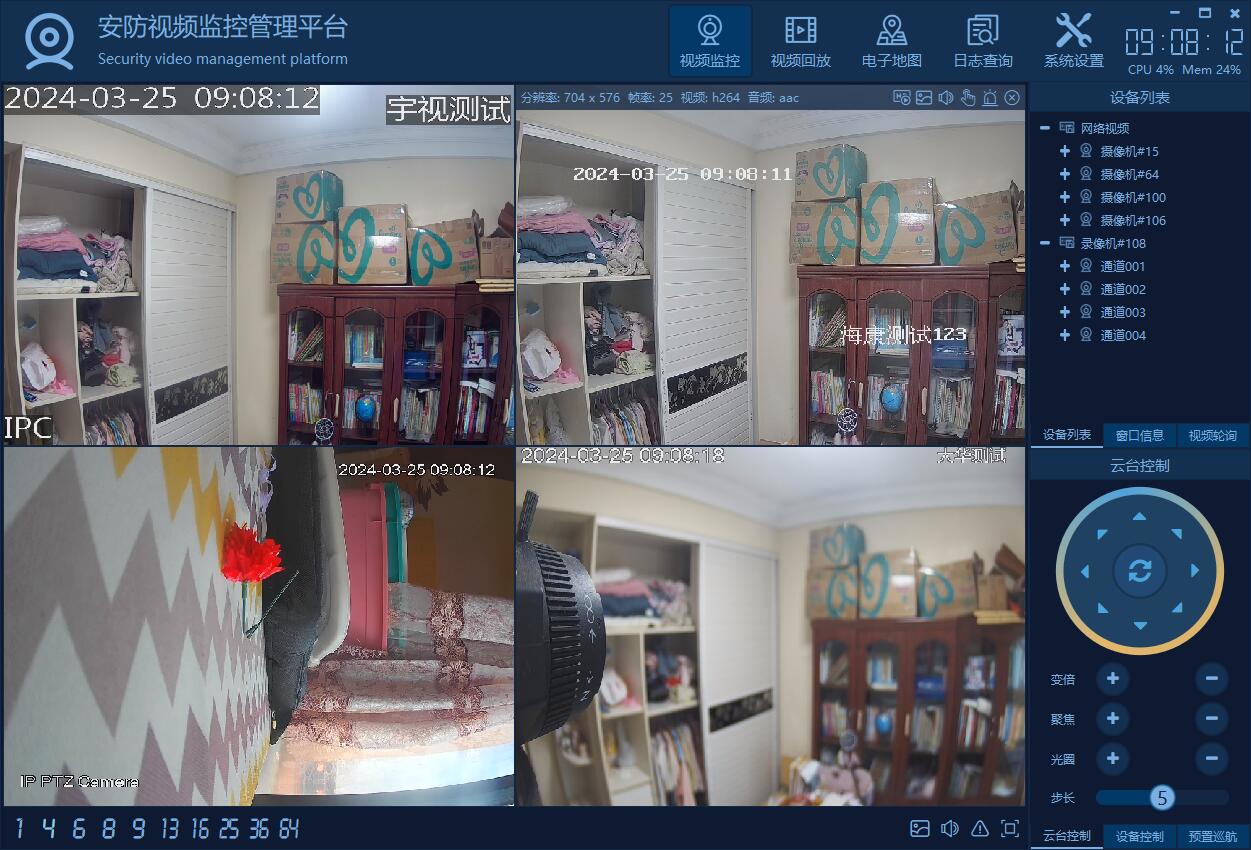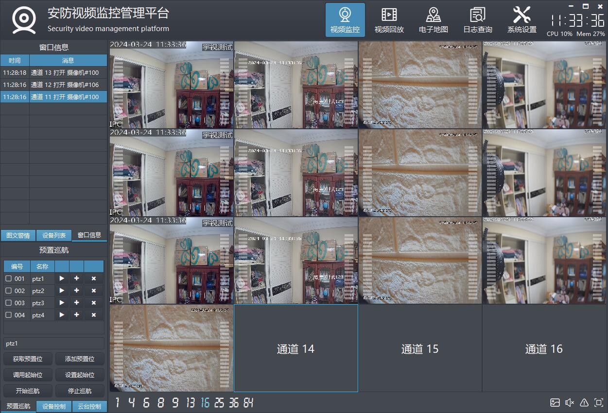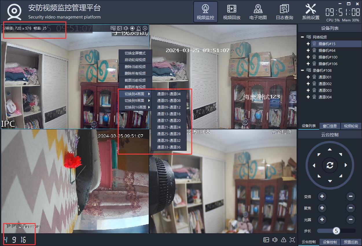 支持多画面切换,包括1、4、6、8、9、13、16、25、36、64画面切换。