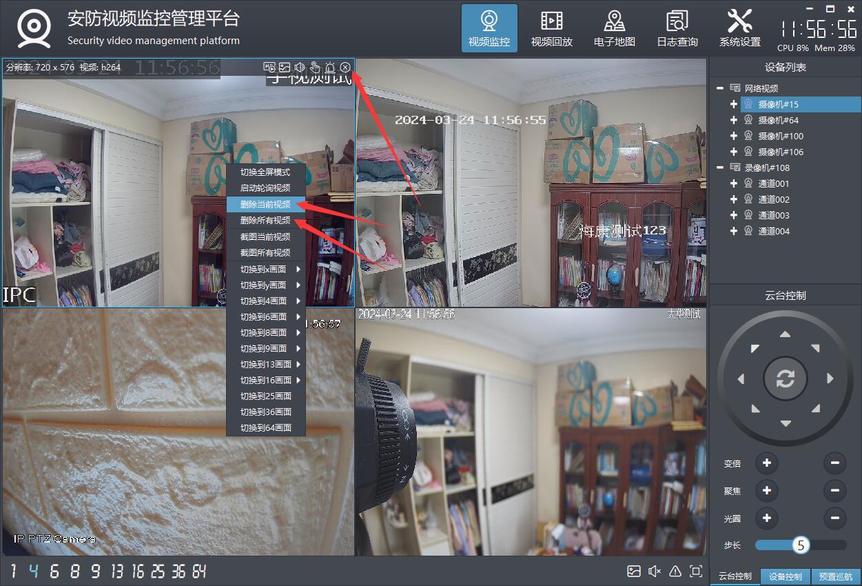删除视频支持鼠标右键删除、悬浮条关闭删除、拖曳到视频监控面板外删除等多种方式。