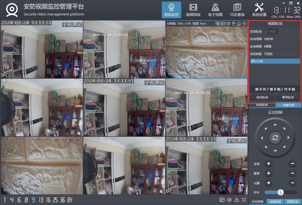 支持视频轮询,包括1、4、9、16画面轮询,可设置轮询分组(轮询预案)、轮询间隔、码流类型等。