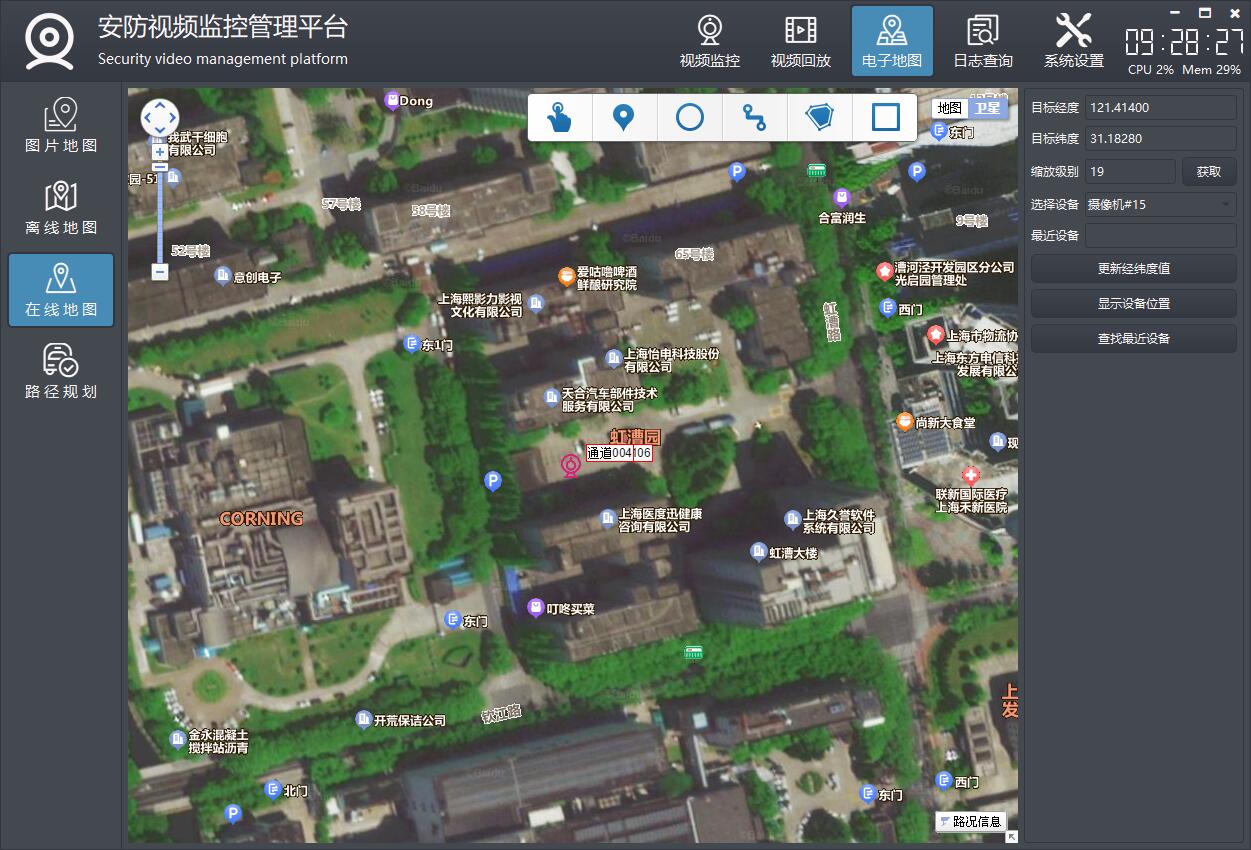 双击设备弹出实时预览视频,支持图片地图、在线地图、离线地图等。