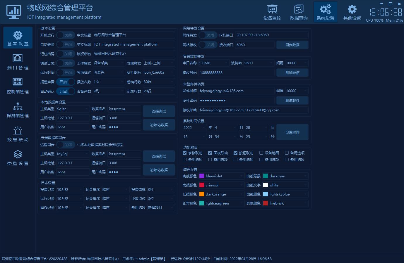 系统设置模块,包括基本设置、端口管理、控制器管理、探测器管理、报警联动、类型设置等。