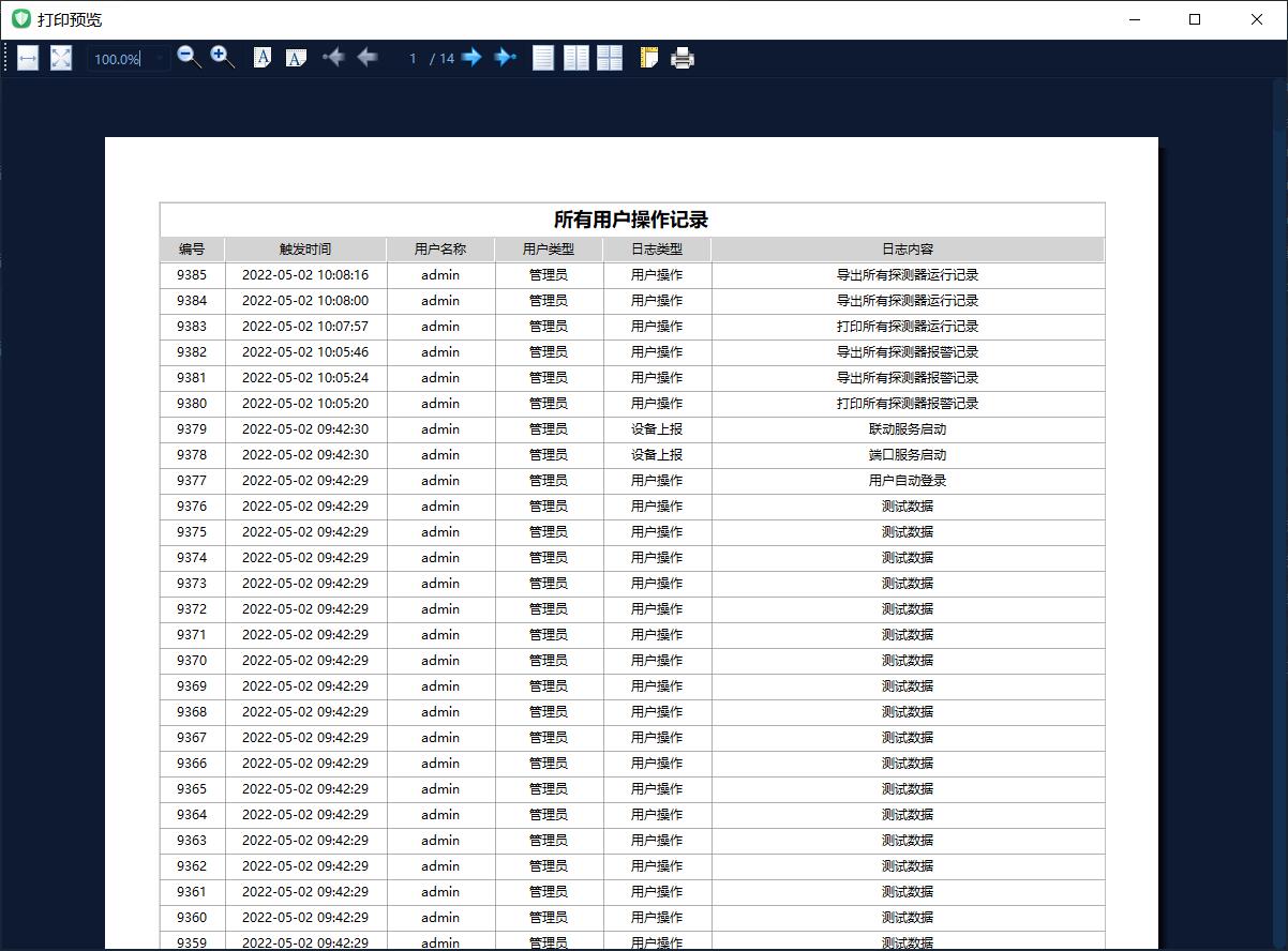 运行记录、报警记录、操作记录,都支持多条件组合查询,比如时间段、控制器、探测器等,所有记录支持导出到excel/pdf和打印。