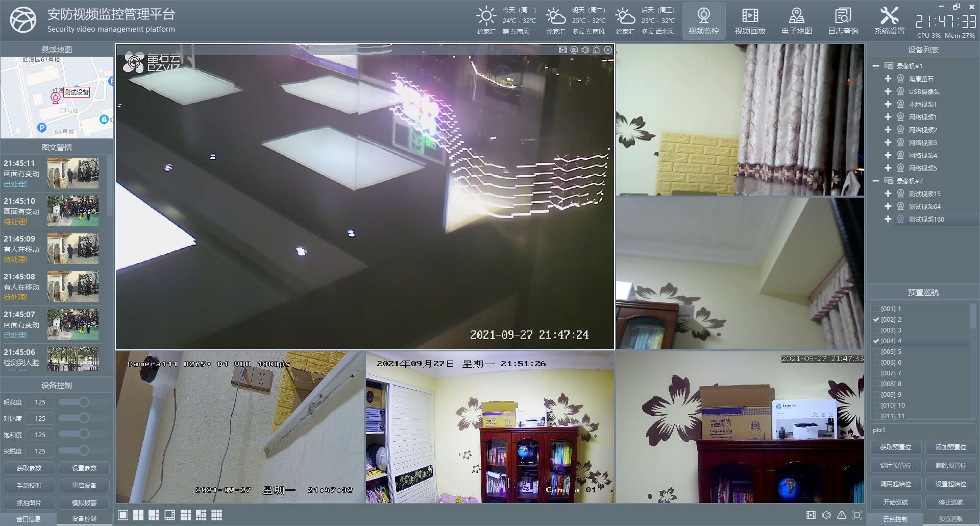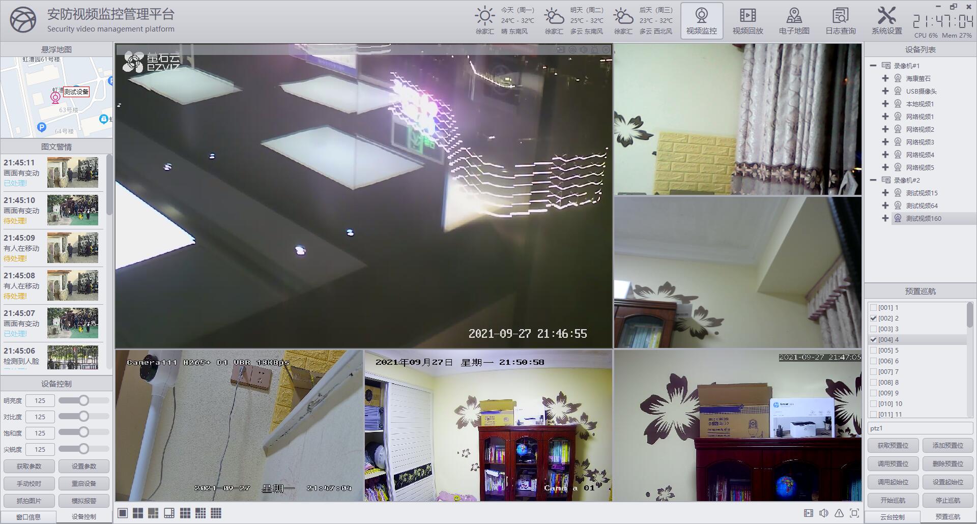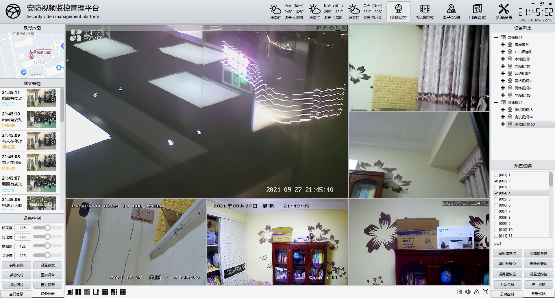 电子地图有多个子模块,分别不同的功能,在每个模块上,双击对应的摄像机,都可以弹出实时视频预览画面,支持多个画面同时打开,每个摄像机都一个画面窗体。