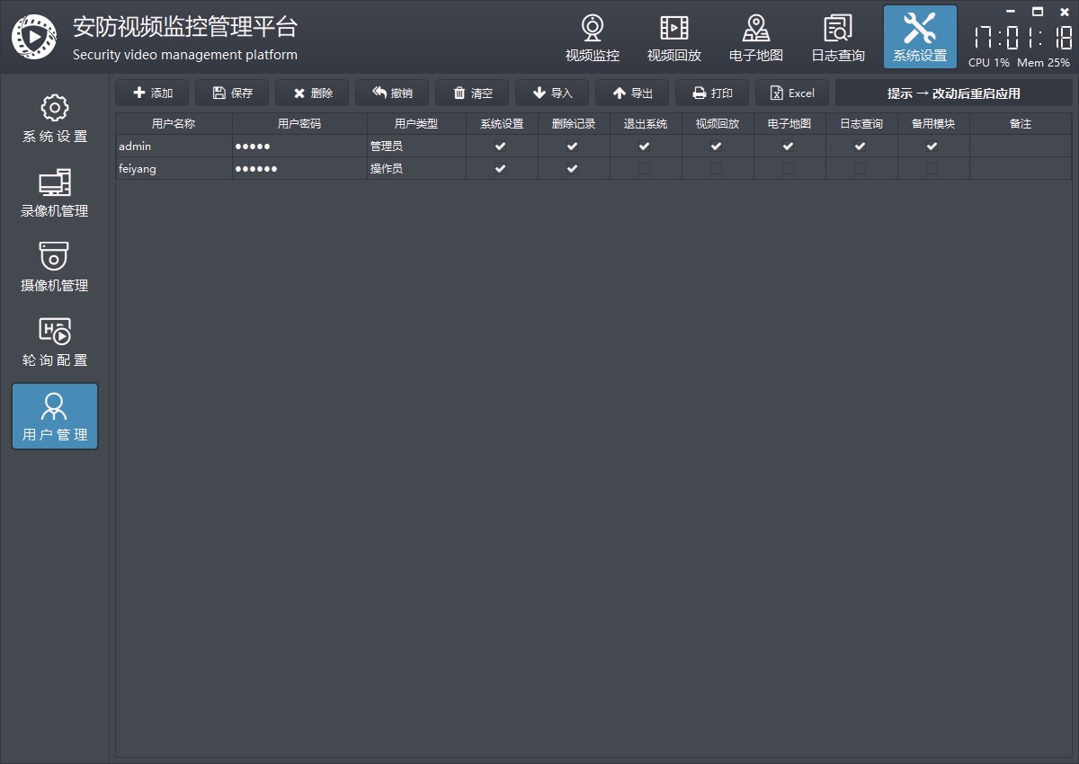 | frmconfiguser | 用户管理,可以增加、删除、修改、清空、导入、导出、打印用户信息。每个用户可以勾选不同的模块权限。 |
