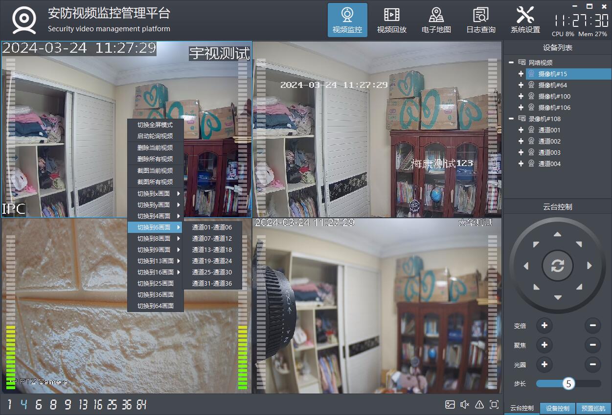 支持多画面切换,包括1、4、6、8、9、13、16、25、36、64画面切换。