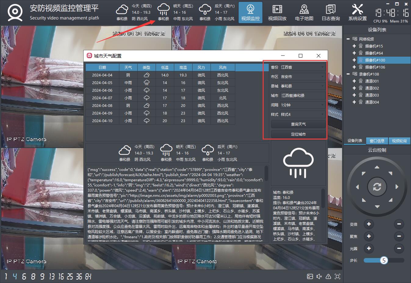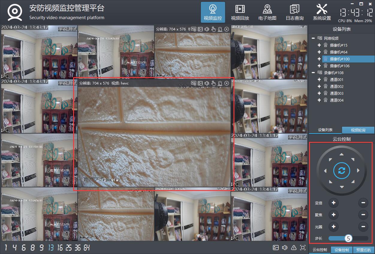 支持onvif云台控制,可上下左右移动云台摄像机,包括复位和焦距调整等。