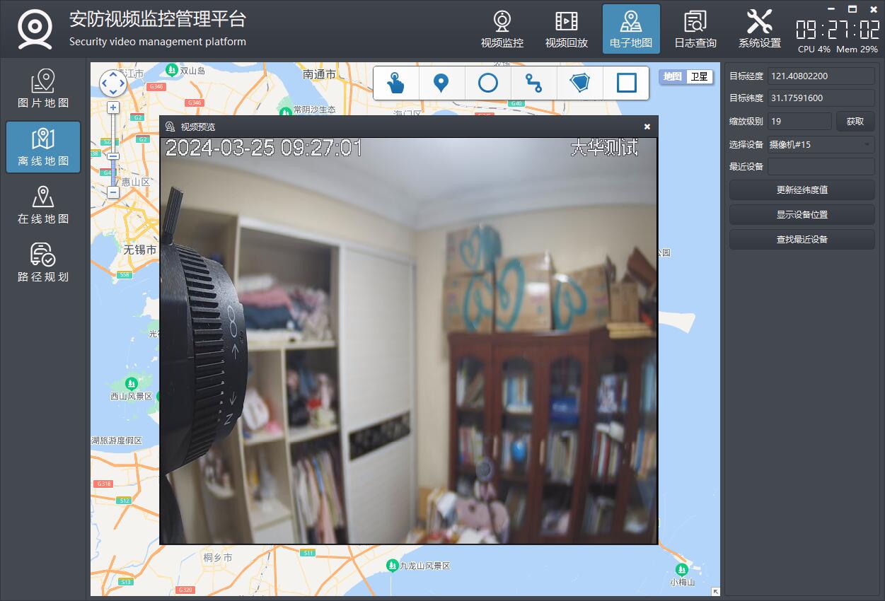双击设备弹出实时预览视频,支持图片地图、在线地图、离线地图等。