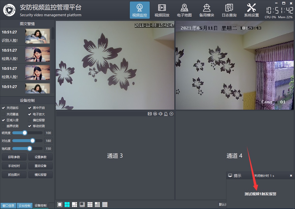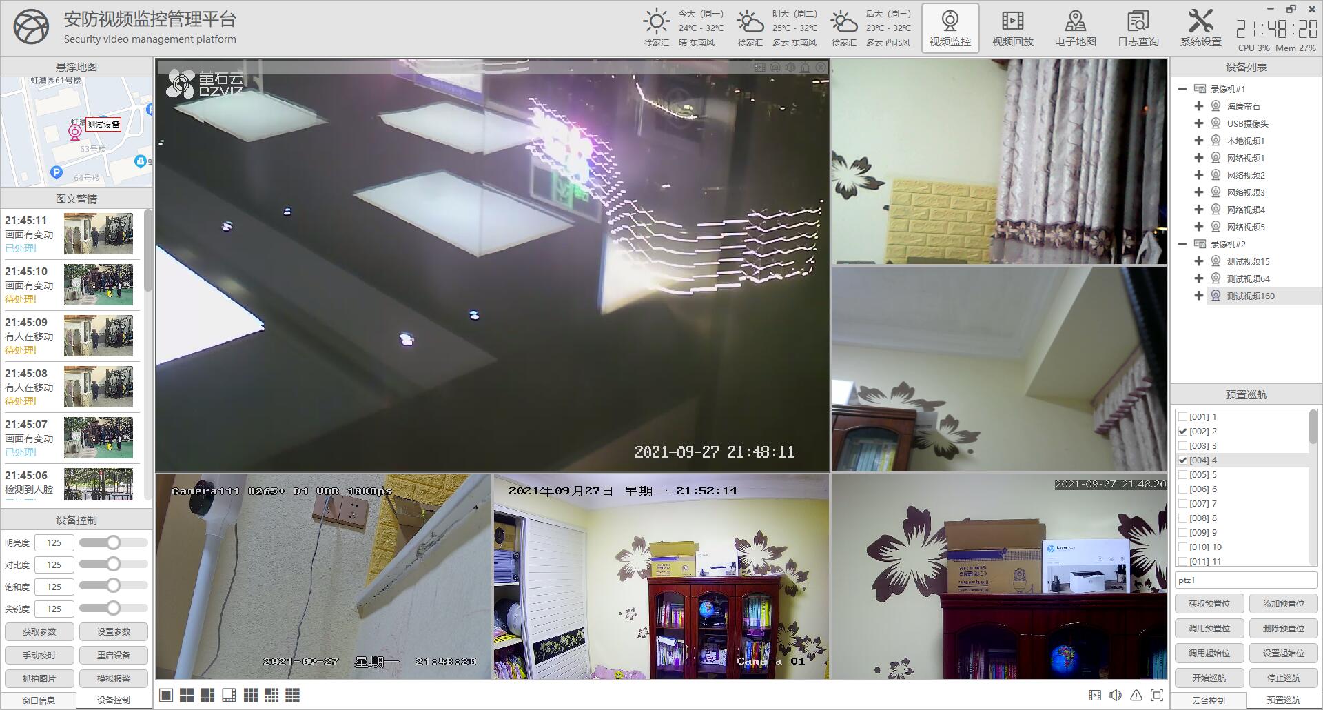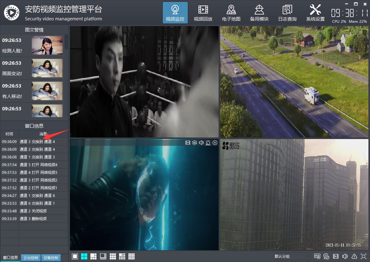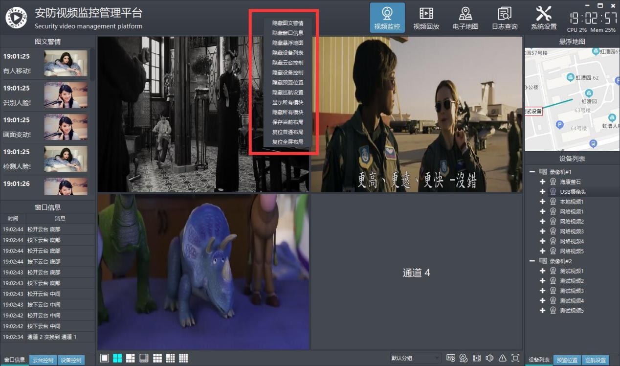 电子地图有多个子模块,分别不同的功能,在每个模块上,双击对应的摄像机,都可以弹出实时视频预览画面,支持多个画面同时打开,每个摄像机都一个画面窗体。