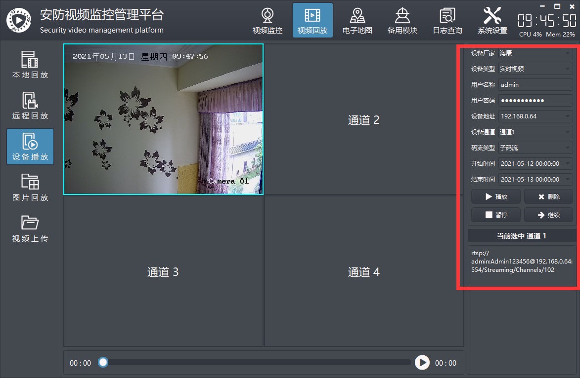 设备播放模块主要是通过rtsp视频流的形式来拉取实时视频和回放视频,现在越来越多的NVR支持直接通过取流的形式来拉取实时视频流和回放视频,这样使用起来很方便,当然在拉取视频流的时候要传入用户信息,防止非法获取,现在越来越多的应用场景需要通过NVR来调取回放视频,传统的SDK的方式非常累厂家太多,而国标的形式太繁琐复杂,于是rtsp形式的最简单的方式应运而生,目前支持的厂家也越来越多,每个厂家格式的规则不一样,可以自行咨询厂家的规则,本程序默认实现了海康、大华和深广的规则。