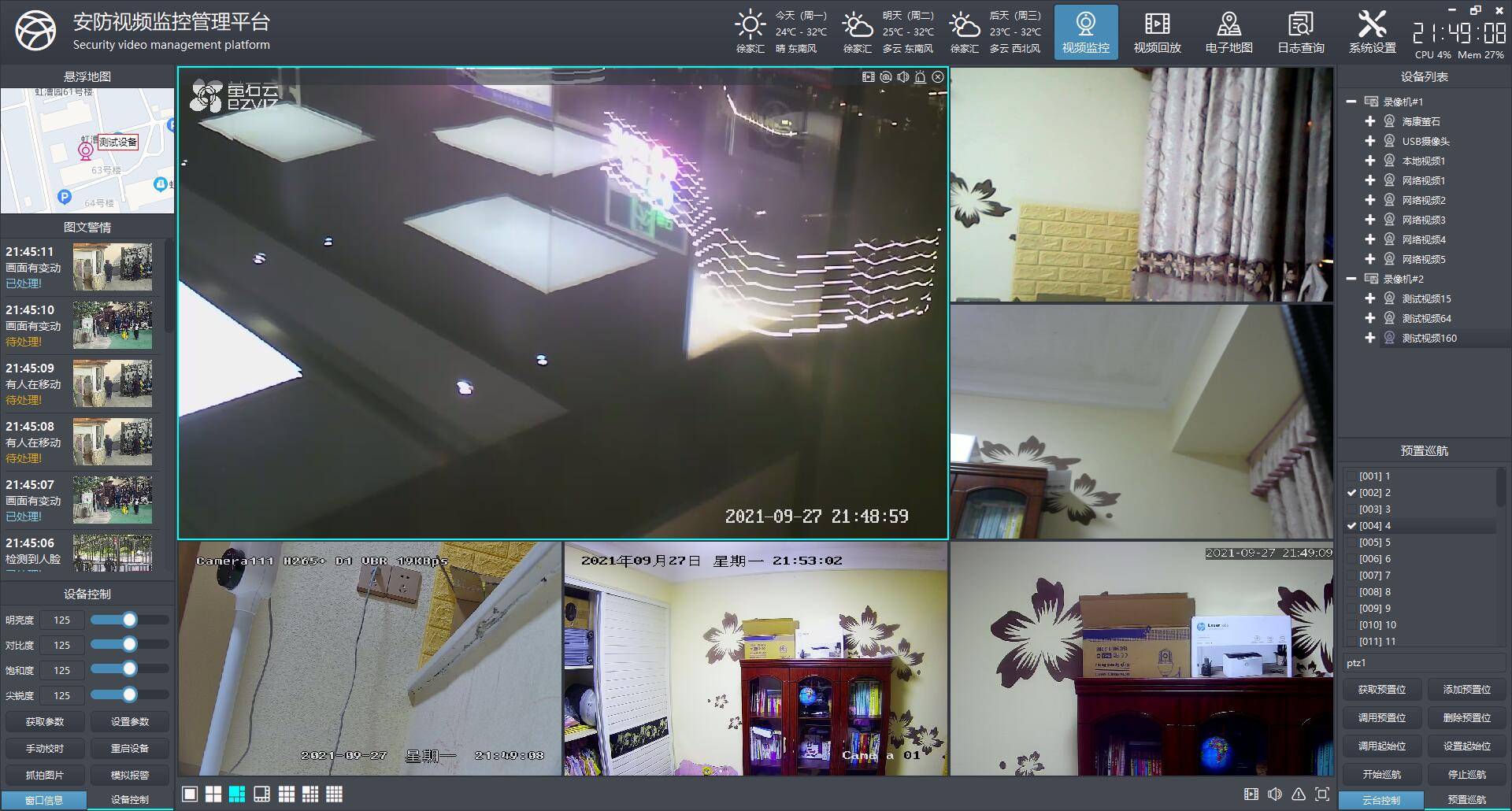 主界面由左侧的设备列表、窗口信息,中间的视频监控画面,底部的画面切换和快捷操作按钮,右侧的云台控制及其他操作功能面板组成,其中左右两侧的面板可以拉伸宽度,上下面板之间也可以拉伸高度,每个带关闭按钮的面板都可以关闭。