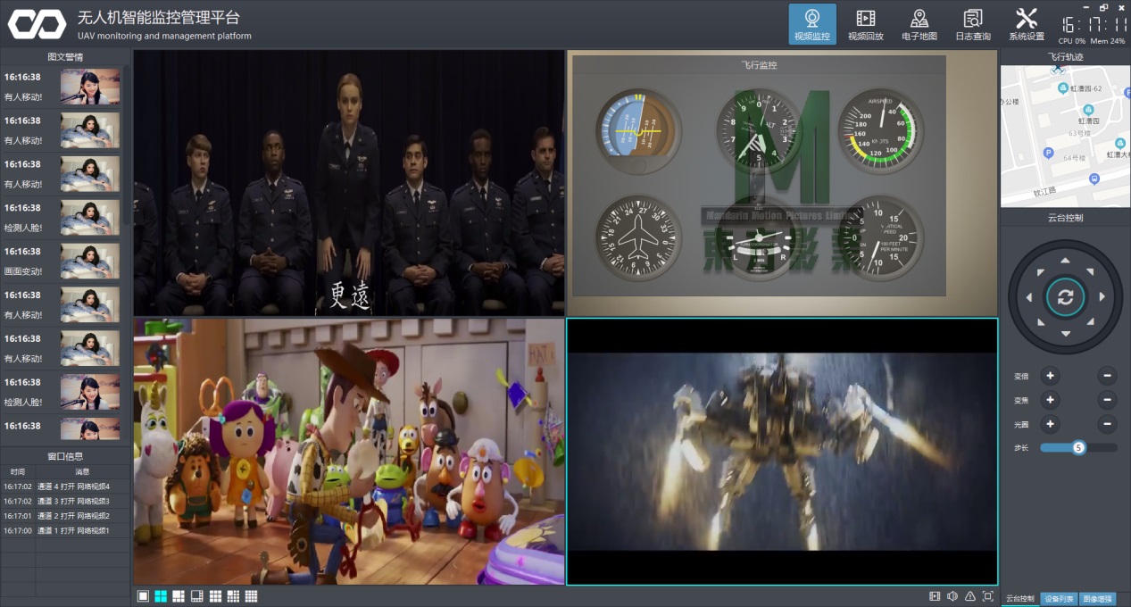 电子地图有多个子模块,分别不同的功能,在每个模块上,双击对应的摄像机,都可以弹出实时视频预览画面,支持多个画面同时打开,每个摄像机都一个画面窗体。