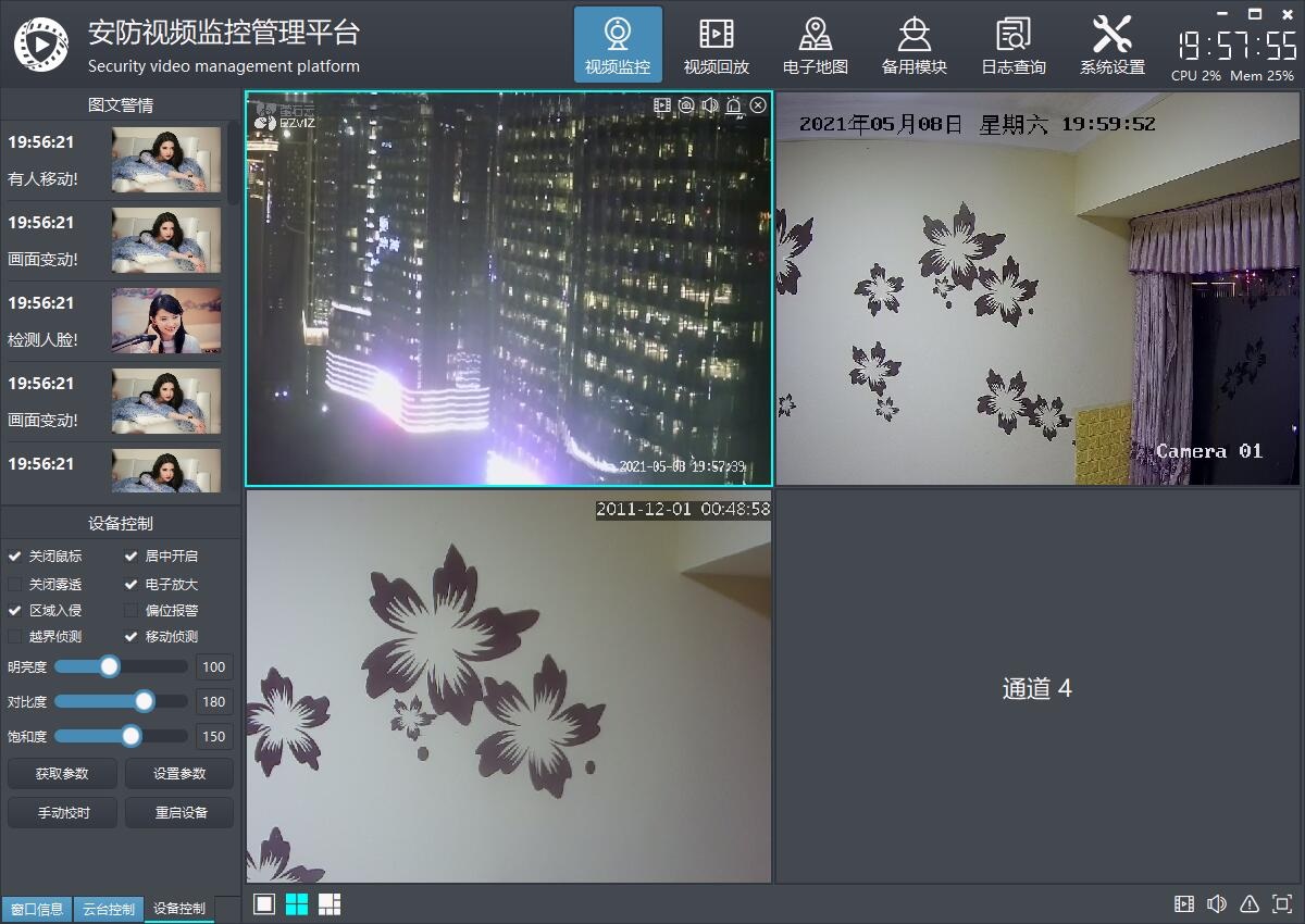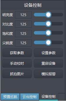 设备控制部分,目前可以获取和设置图片参数、手动校时、重启设备等,上面那一堆复选框对应功能需要用厂家sdk去实现,后期可能会增加一些onvif能够处理的功能。和云台控制操作一样,操作前也是需要选中某个通道,然后才是对选中的通道进行设备控制,比如图片参数中的明亮度、对比度、饱和度。