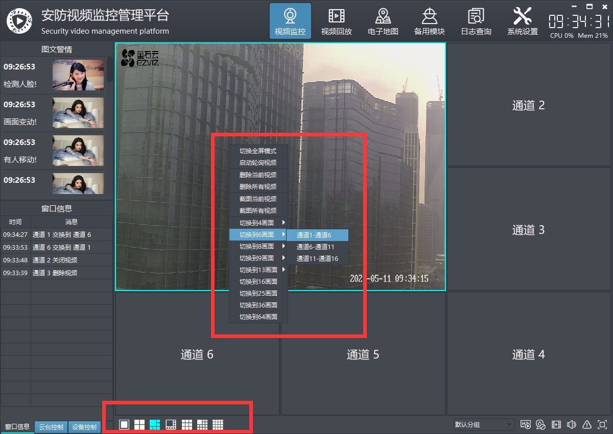 系统支持多画面切换,全屏切换等,包括1+4+6+8+9+13+16+25+36+64画面切换,如果还需要增加更多的画面比如81+100等,可以直接在源码中稍微修改即可。