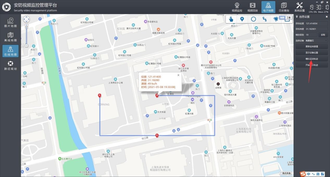 在右侧还有模拟运动轨迹、开始显示轨迹两个按钮,有可能后期还会增加其他功能,是为了演示如何在地图上实现地图的相关功能,开始显示轨迹采用的定时器来生成轨迹点数据,动态模拟运动轨迹,可以单击显示设备位置按钮还原最初的设备点位图。