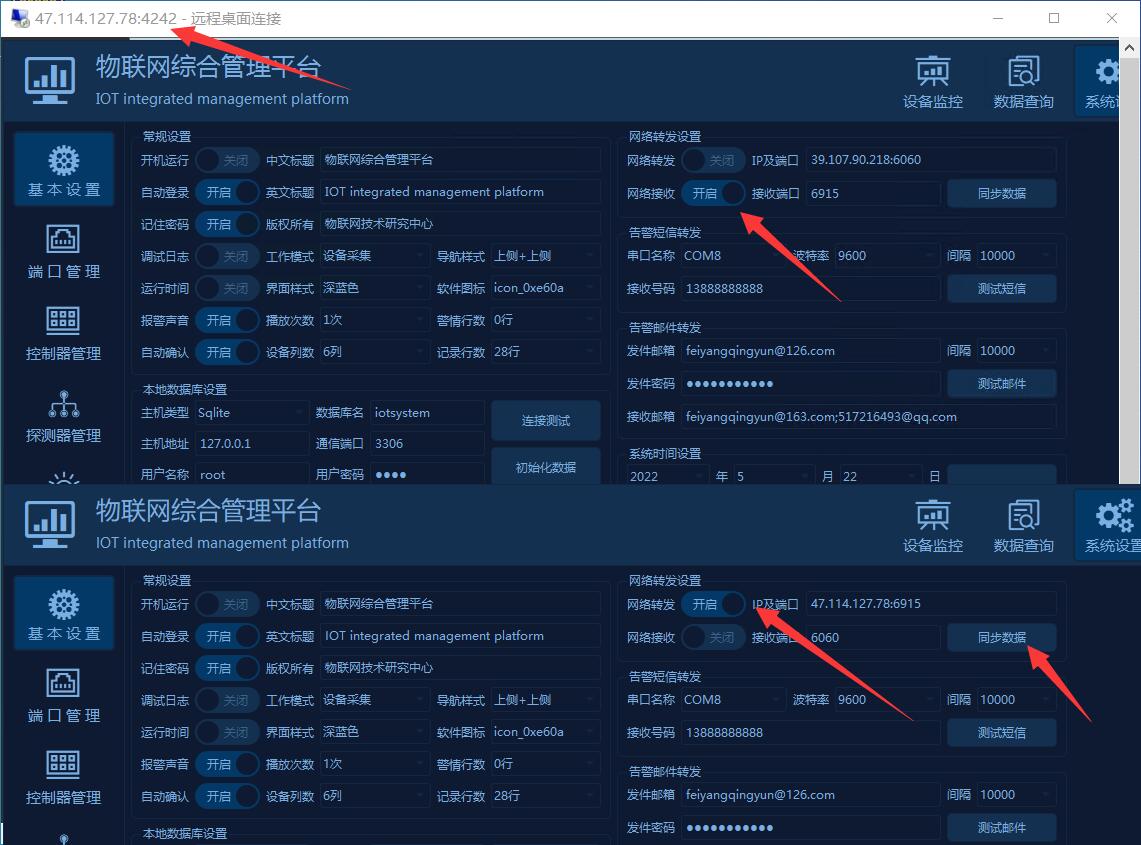 网络转发端,单击同步数据会把本地的端口信息、控制器信息、探测器信息发到远端。网络转发模块也可以作为无限级联使用,比如接收端还可以开启转发,继续转发给需要的地方,一个客户端上设置的转发也支持多个,用英文分号 ; 隔开,一对多关系,采用的无连接udp协议,几乎不占用系统资源。