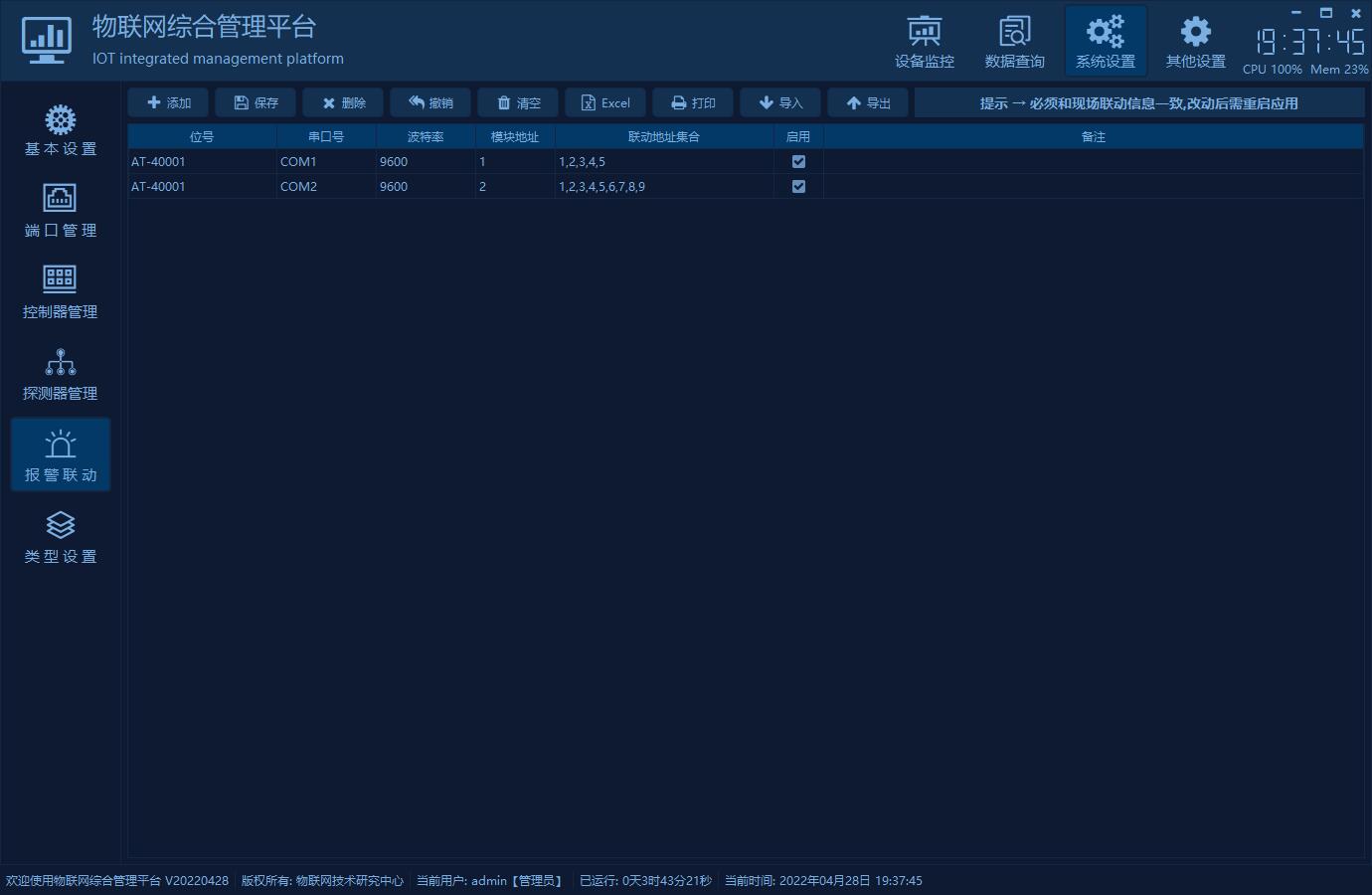 系统设置模块,包括基本设置、端口管理、控制器管理、探测器管理、报警联动、类型设置等。