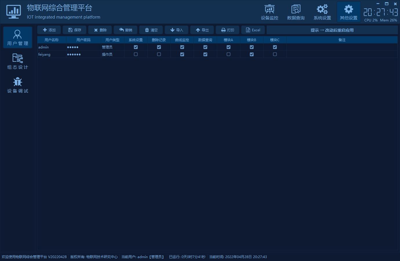 权限控制增加用户管理、组态设计等,替换之前备用的模块A、模块B。