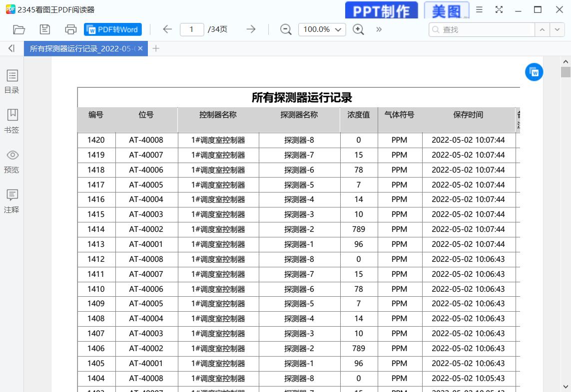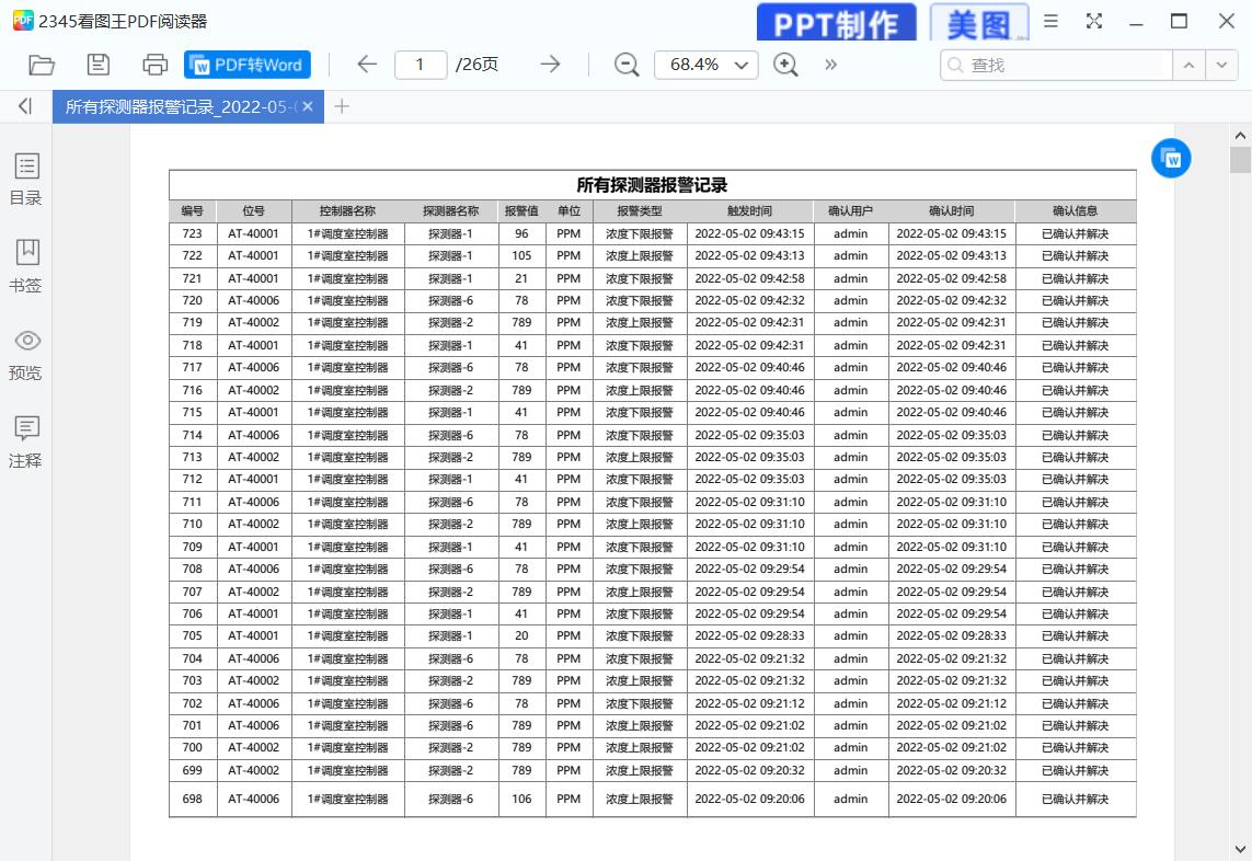 运行记录、报警记录、操作记录,都支持多条件组合查询,比如时间段、控制器、探测器等,所有记录支持导出到excel/pdf和打印。