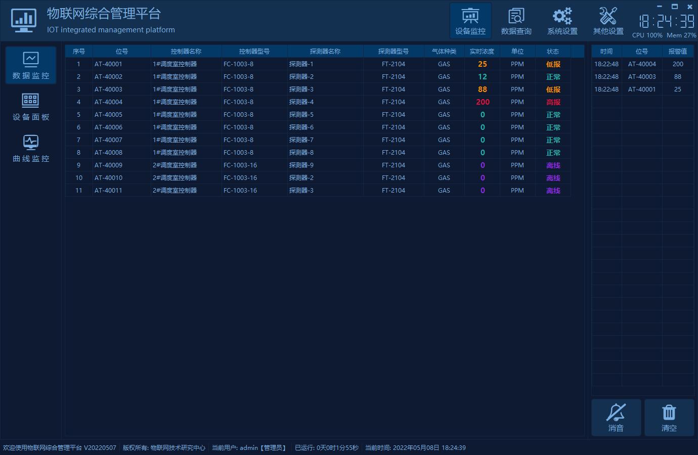 四种监控模式,设备面板监控、地图监控、表格数据监控、曲线数据监控,可自由切换,四种模式下都实时展示采集到的数据,报警闪烁等。
