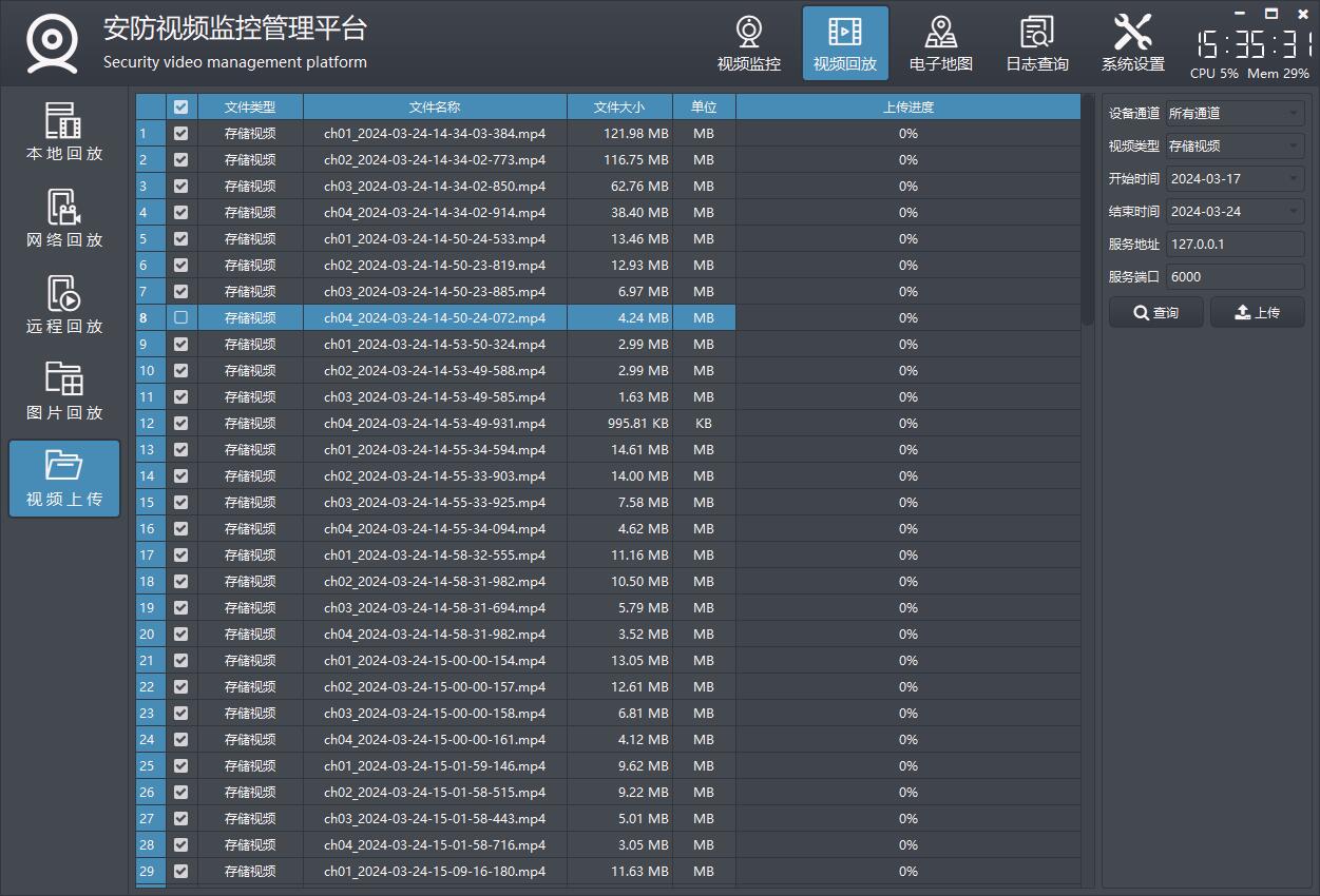 存储的视频文件支持导出到指定目录,支持批量上传到服务器。