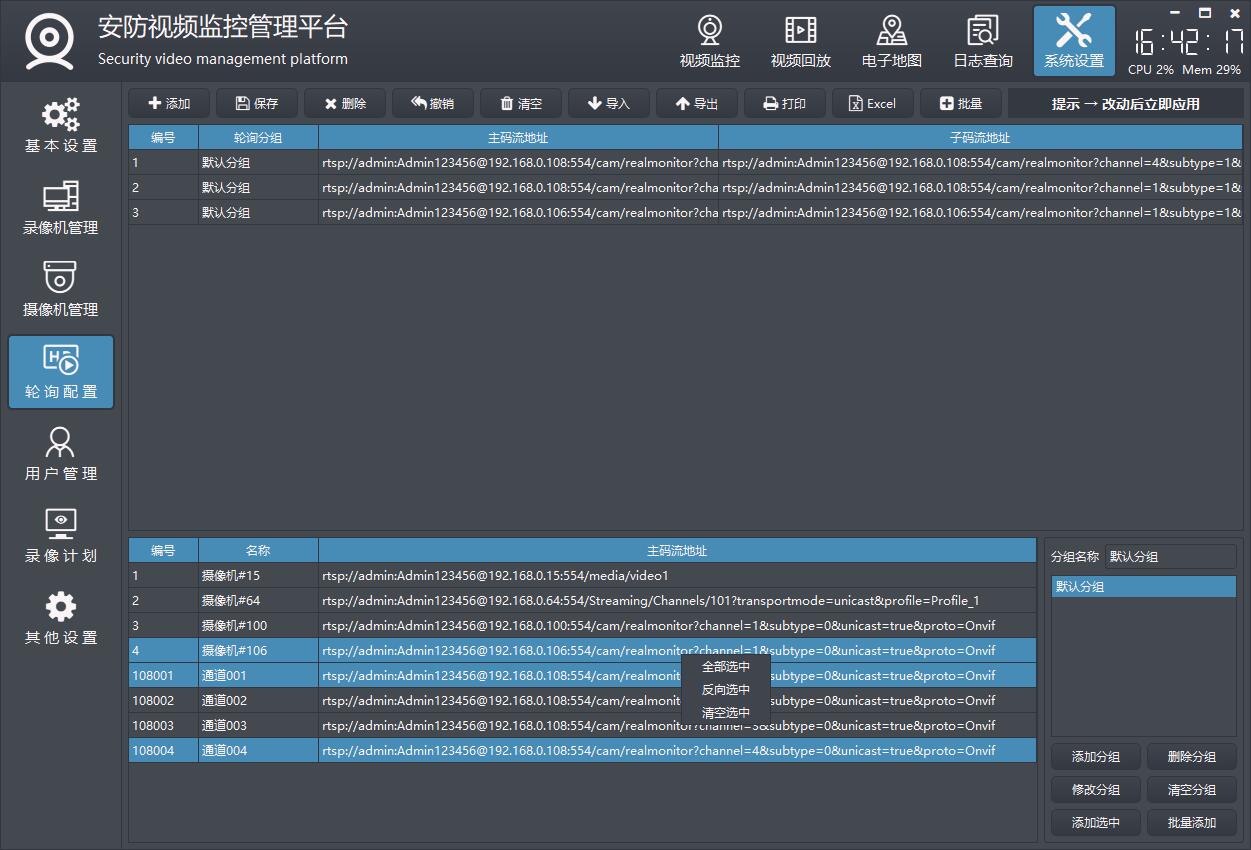支持视频轮询,包括1、4、9、16画面轮询,可设置轮询分组(轮询预案)、轮询间隔、码流类型等。