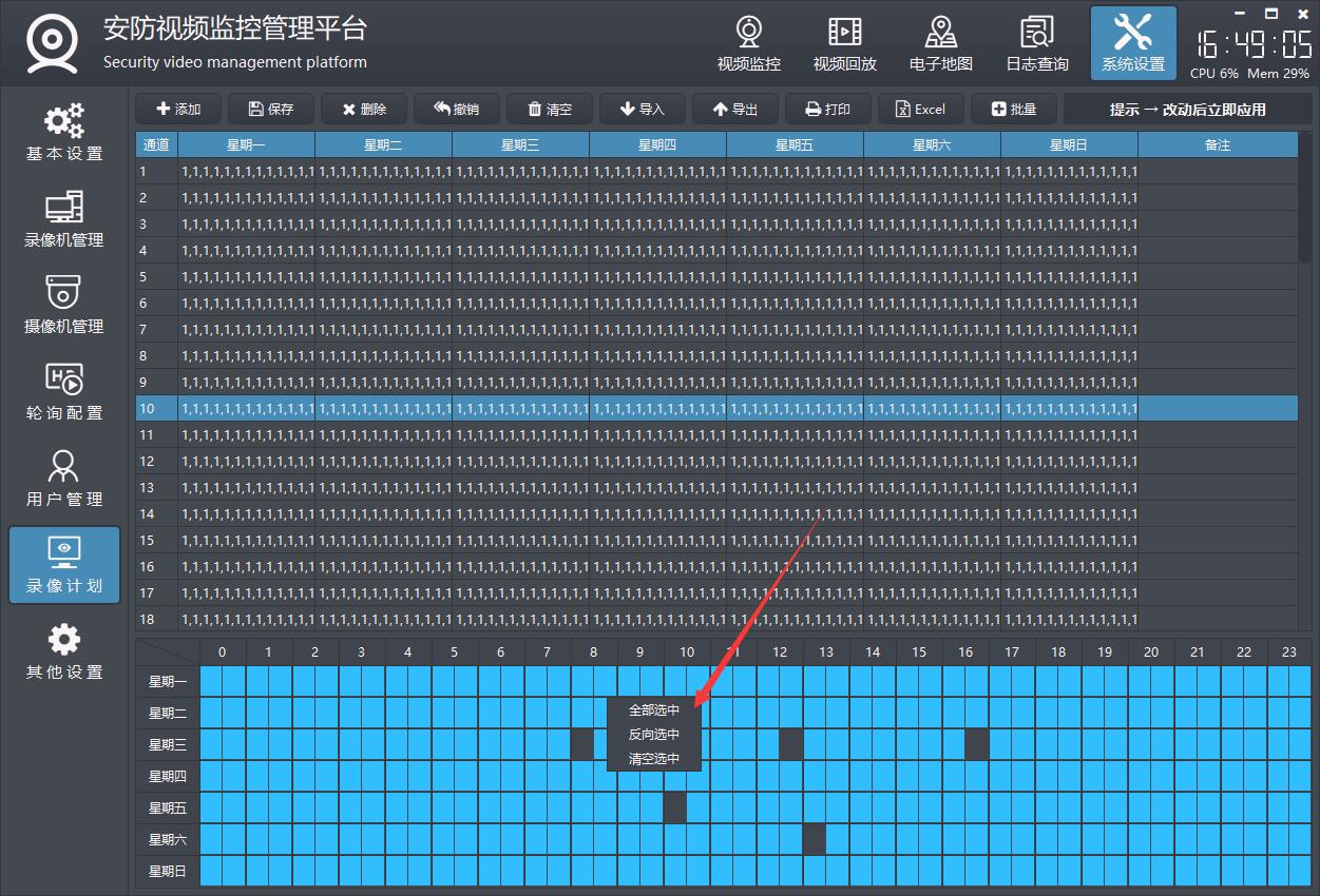 完善的录像计划设置,支持每个通道7 * 24小时每半小时设置是否存储录像。