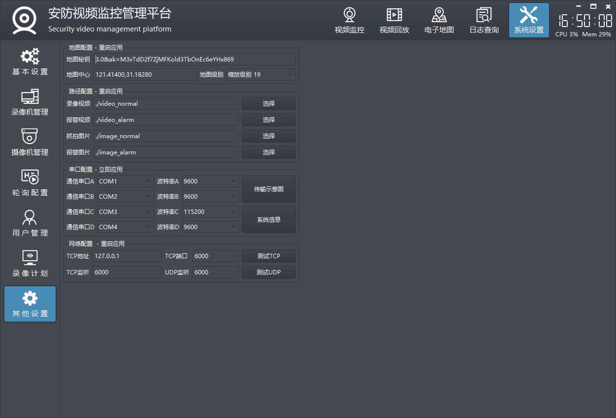 系统设置模块,包括系统设置(基本设置、视频参数、数据库设置、地图配置、串口配置等)、录像机管理、摄像机管理、轮询配置、录像计划、用户管理等。