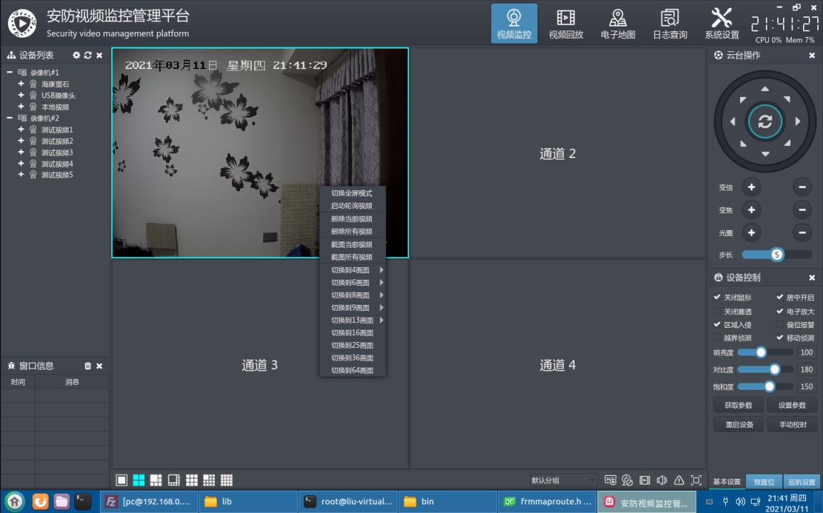 设备控制部分,目前可以获取和设置图片参数、手动校时、重启设备等,上面那一堆复选框对应功能需要用厂家sdk去实现,后期可能会增加一些onvif能够处理的功能。和云台控制操作一样,操作前也是需要选中某个通道,然后才是对选中的通道进行设备控制,比如图片参数中的明亮度、对比度、饱和度。