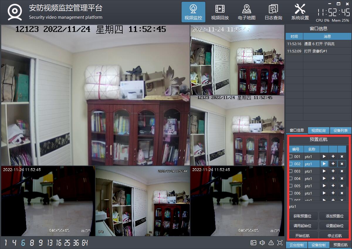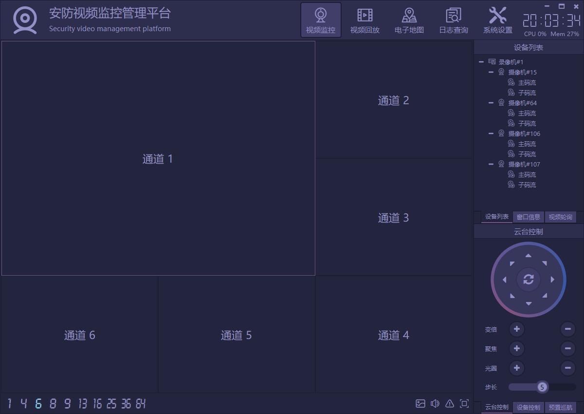 主要功能包括摄像机管理,实时视频显示,视频轮询、视频存储、设备地图显示,各种画面切换,各种悬停子模块、onvif搜索设备和云台控制及预置位,通用的NVR视频流播放(比如海康的NVR支持直接取流回放),录像计划、用户管理等功能。