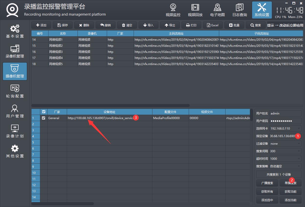 在设备搜索那边指定设备填入IP地址和端口,单击单播搜索按钮,会自动搜索到设备的onvif地址,然后填入onvif用户信息,此时再去单击获取所有,如果有返回信息则表示正常。