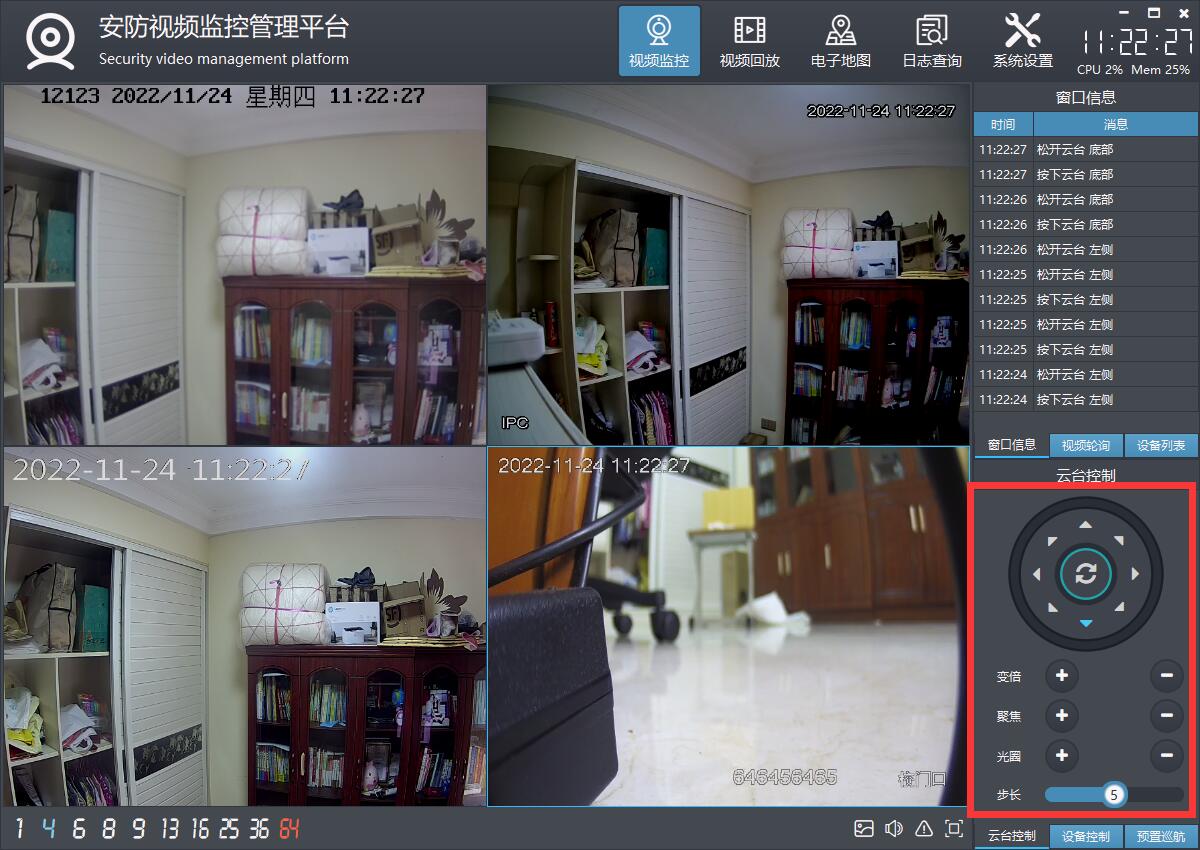 支持onvif云台控制,可上下左右移动云台摄像机,包括复位和焦距调整等。