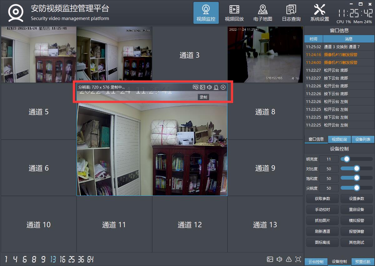 支持视频截图,可指定单个或者对所有通道截图,底部小工具栏也有截图按钮。