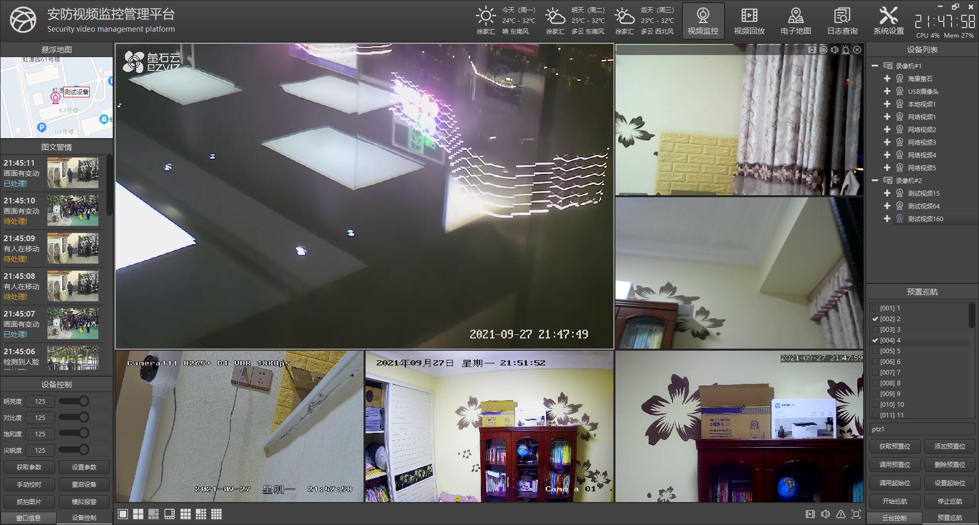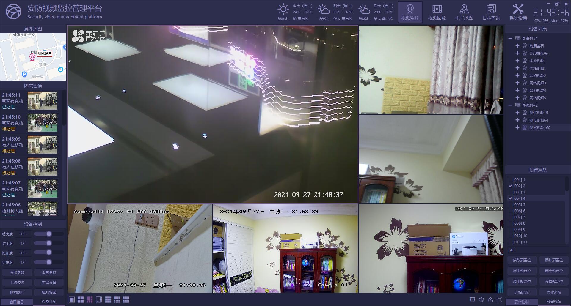 电子地图有多个子模块,分别不同的功能,在每个模块上,双击对应的摄像机,都可以弹出实时视频预览画面,支持多个画面同时打开,每个摄像机都一个画面窗体。