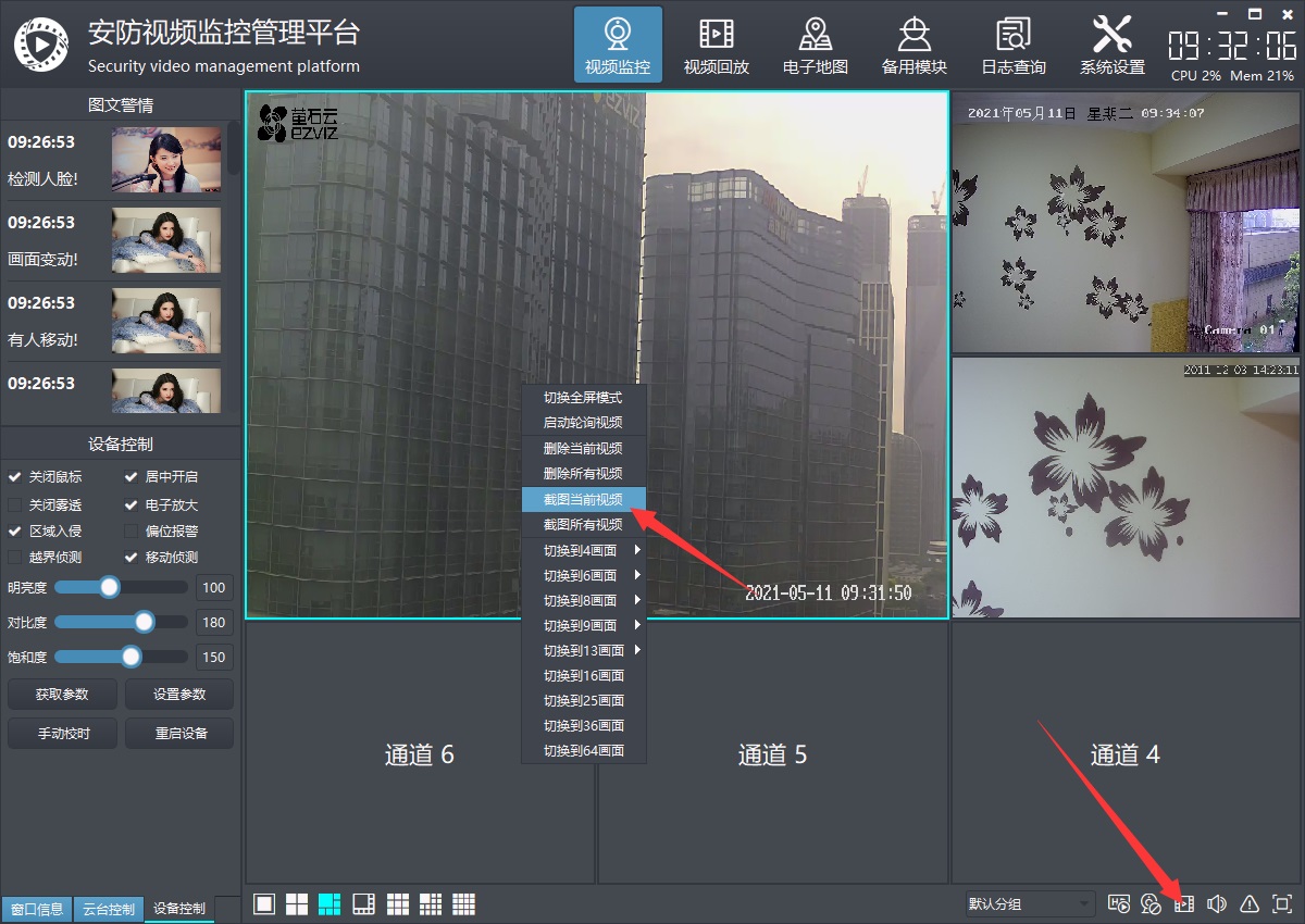在视频监控主界面,通道鼠标右键,会弹出右键菜单,选择截图当前视频或者截图所有视频,截图默认保存在可执行文件所在目录下的snap目录。视频面板底部工具栏也有截图按钮触发这个动作。