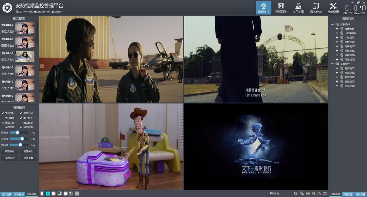 主界面由左侧的设备列表、窗口信息,中间的视频监控画面,底部的画面切换和快捷操作按钮,右侧的云台控制及其他操作功能面板组成,其中左右两侧的面板可以拉伸宽度,上下面板之间也可以拉伸高度,每个带关闭按钮的面板都可以关闭。