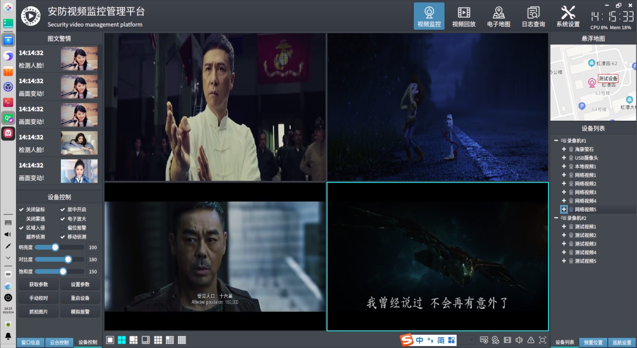 视频监控系统支持多种工作模式,不同的工作模式可以有不同的主界面、悬停模块、布局方案。互相不影响。悬停模块可以有透明度,更具科幻感。