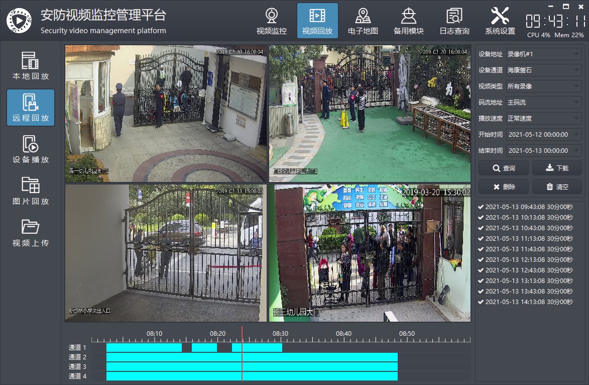 远程回放模块是用来通过sdk的形式回放远程NVR设备上的录像文件,这个暂未实现,本系统主要是为了兼容性和通用性,通过具体sdk形式调用的处理都没有做,破坏了移植性,到了其他平台就没法使用了,本系统sdk使用这块默认用的海康sdk作为示例。