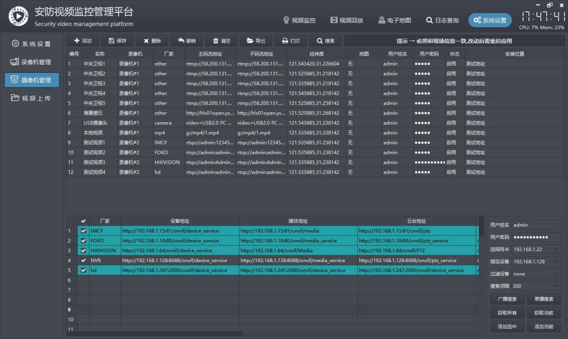 本系统云台控制走的是onvif协议,没有使用私有协议,上百家厂家的摄像机,走私有协议会玩死人的,所以统一采用onvif通用协议,需要提前在系统设置中的摄像机管理,搜索摄像机,输入正确的onvif用户信息后一键获取到云台地址。