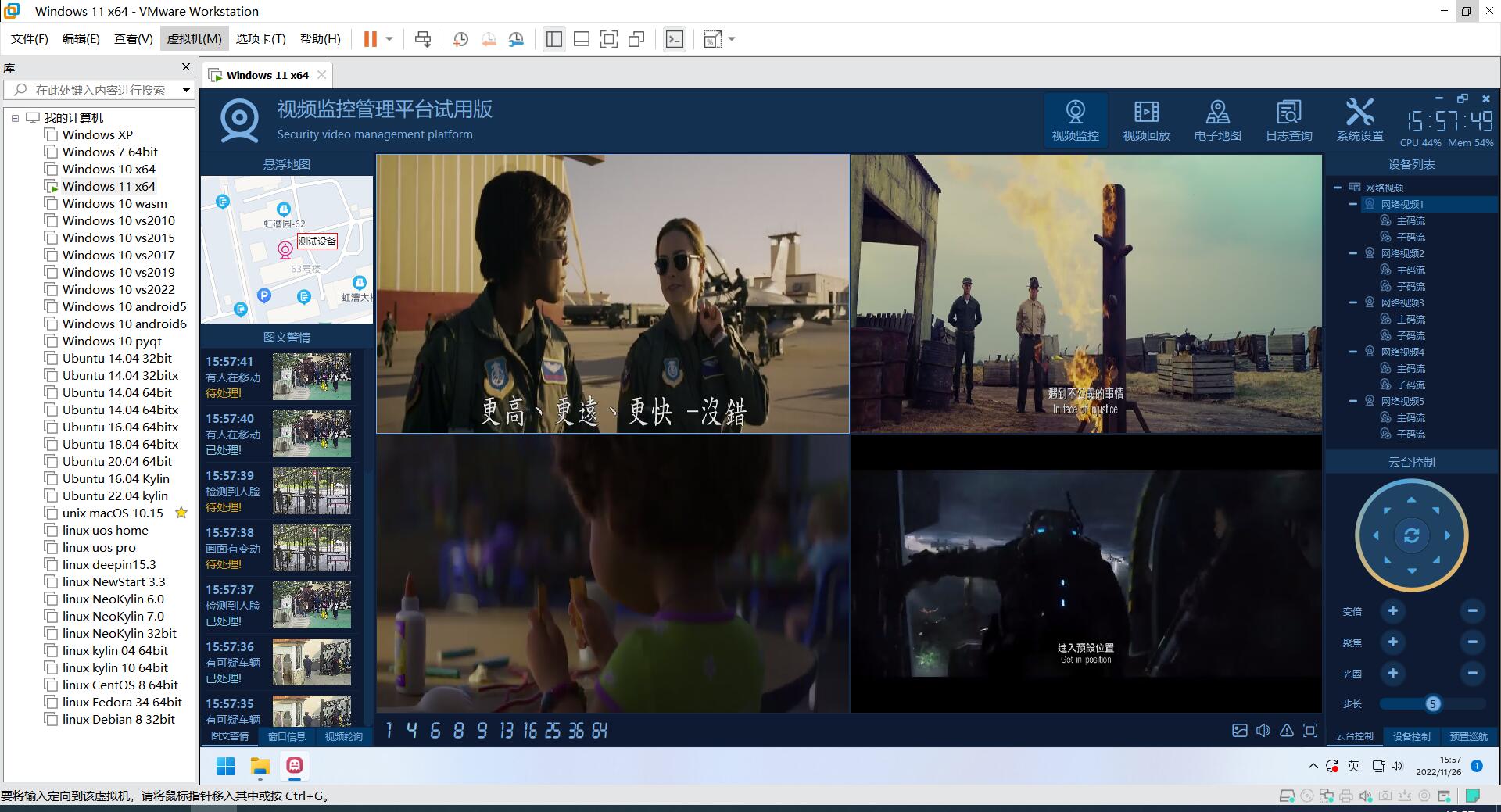 视频监控模块,各种停靠小窗体子模块,包括设备列表、图文警情、窗口信息、云台控制、预置位、巡航设置、设备控制、悬浮地图、网页浏览等。