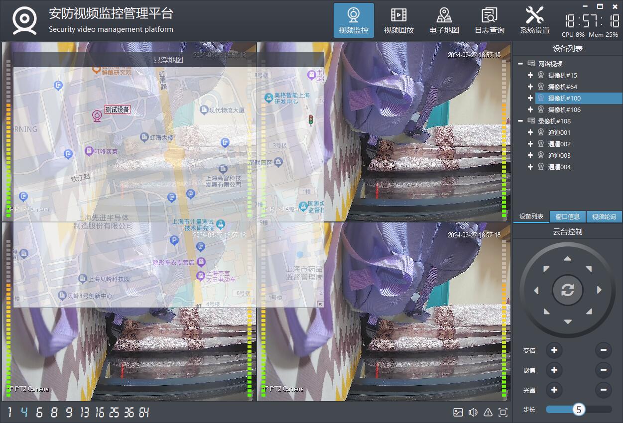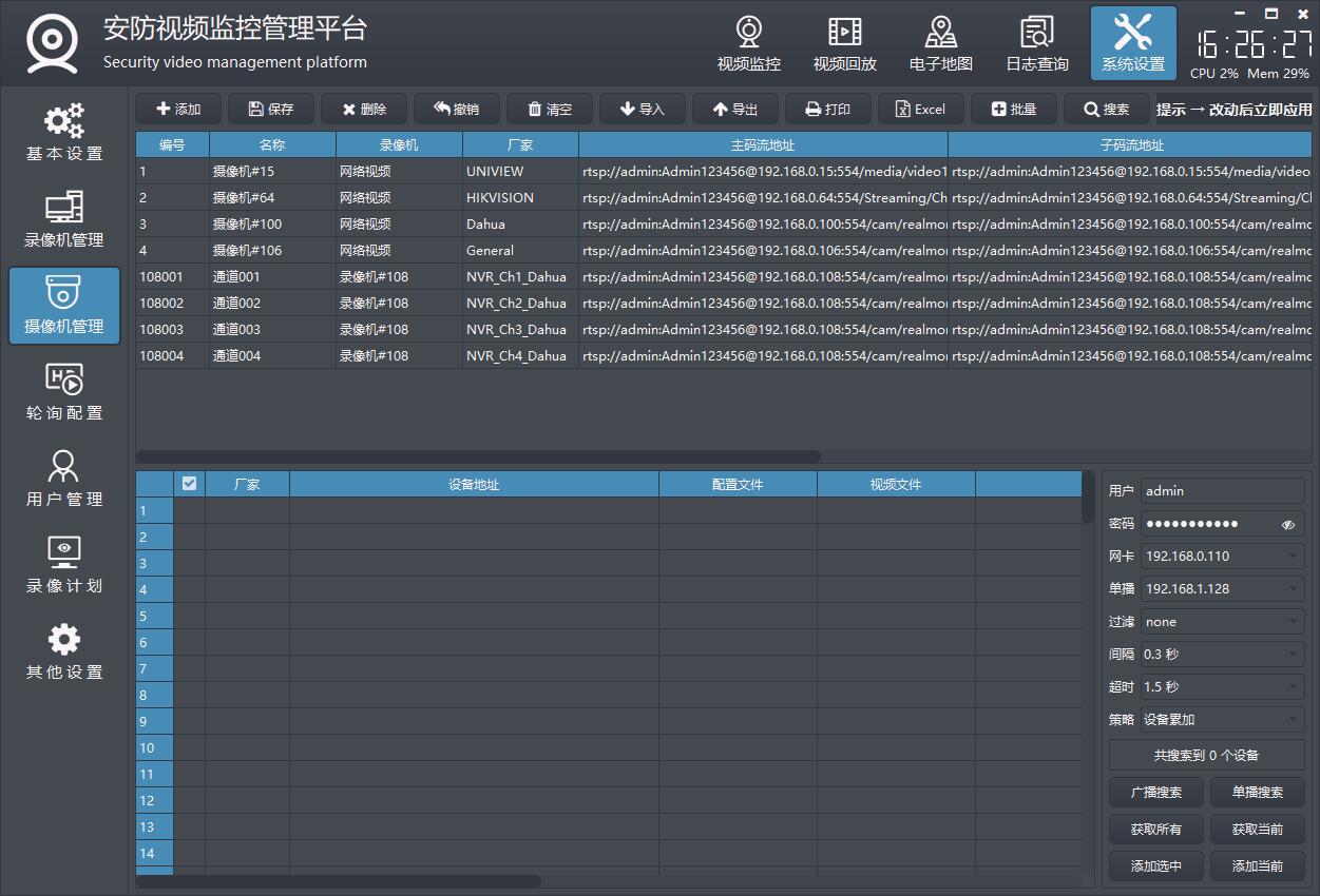 主要功能包括摄像机管理,实时视频显示,视频轮询、视频存储、设备地图显示,各种画面切换,各种悬停子模块、onvif搜索设备和云台控制及预置位,通用的NVR视频流播放(比如海康的NVR支持直接取流回放),录像计划、用户管理等功能。