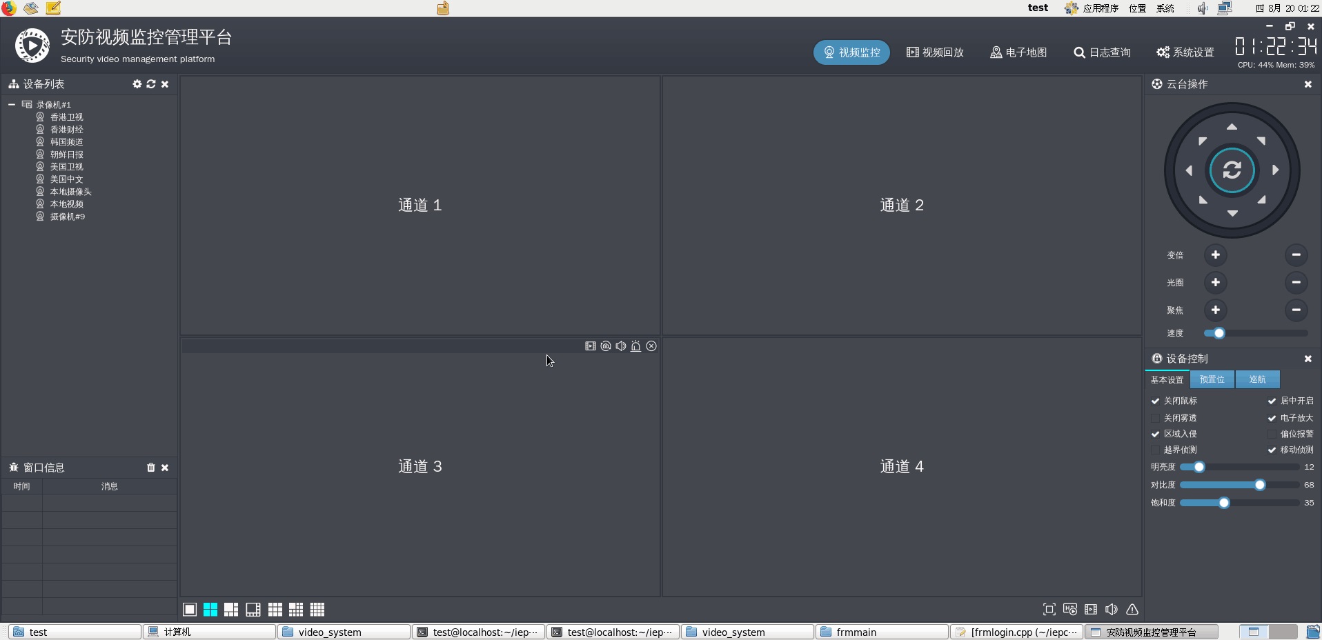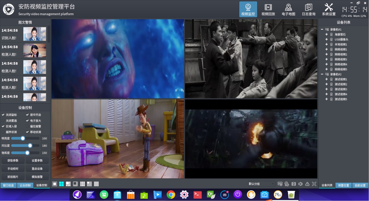 设备控制部分,目前可以获取和设置图片参数、手动校时、重启设备等,上面那一堆复选框对应功能需要用厂家sdk去实现,后期可能会增加一些onvif能够处理的功能。和云台控制操作一样,操作前也是需要选中某个通道,然后才是对选中的通道进行设备控制,比如图片参数中的明亮度、对比度、饱和度。