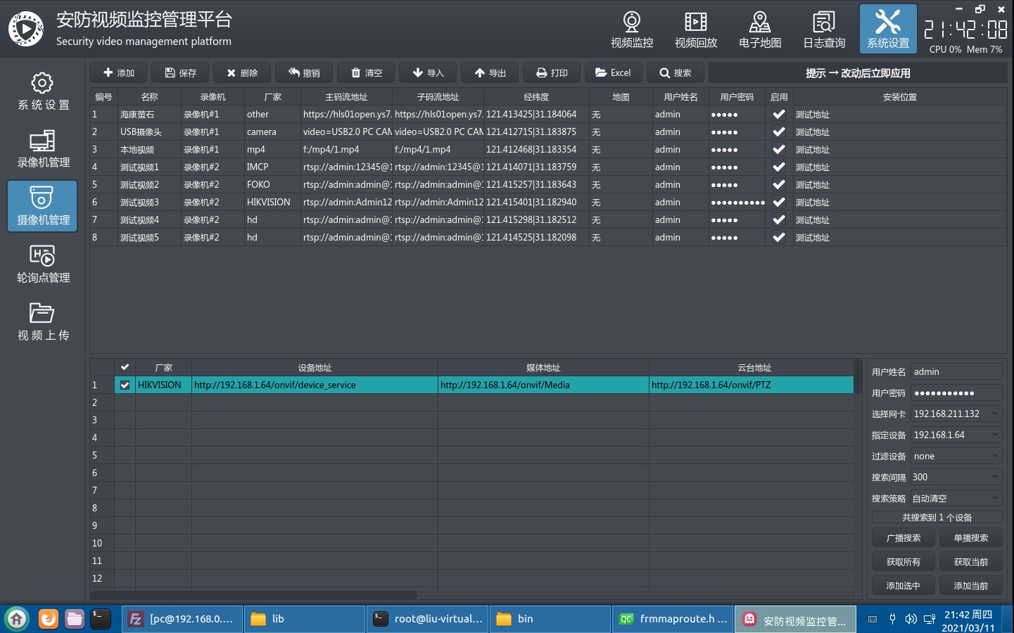 本系统云台控制走的是onvif协议,没有使用私有协议,上百家厂家的摄像机,走私有协议会玩死人的,所以统一采用onvif通用协议,需要提前在系统设置中的摄像机管理,搜索摄像机,输入正确的onvif用户信息后一键获取到云台地址。