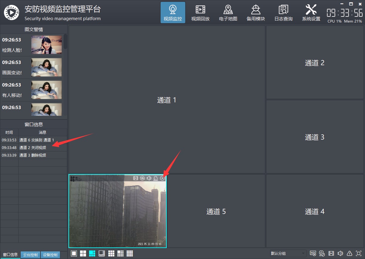 电子地图有多个子模块,分别不同的功能,在每个模块上,双击对应的摄像机,都可以弹出实时视频预览画面,支持多个画面同时打开,每个摄像机都一个画面窗体。